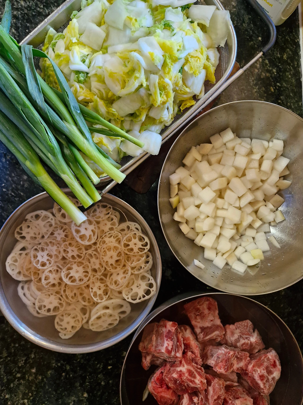 미팅이 시드니에 있어서 9시 20분엔 출발을 해야 한다. 정신없이 서둘러야 할 시간인데, 나는 이미 어제 절여둔 배추를 헹구고, 감자탕 고기의 핏물을 빼고, 조림용 연근은 씻어 식촛물에 담가두고, 깍두기용 무도 반듯하게 썰어두고 있었다. 동시에 아침 식사를 차리고, 도시락도 싸고 있다.