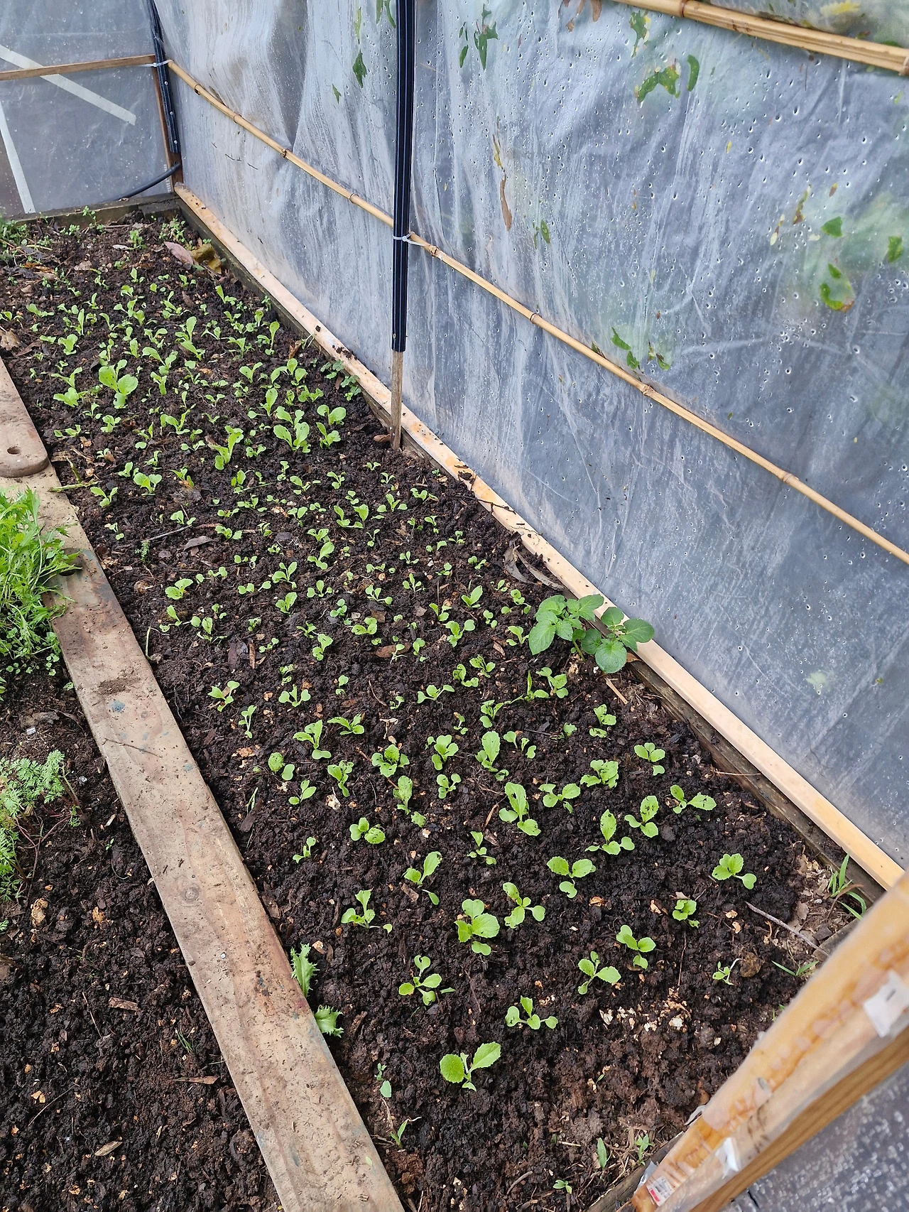빈자리에 엇갈이 배추씨를 한 움큼 뿌렸더니 모조리 싹이 났다. 비가 오는 날 온실 안에 고이 옮겨 심었다. 한 달 후엔 엇갈이배추 수확이 대단할 것 같다.