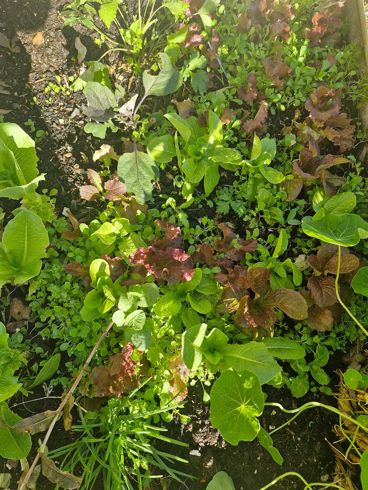 루꼴라, 상추, 부추등을 함께 키우는 베드이다. 향이 강한 야채들을 섞어 키우면 방충효과가 있어서 좋다.