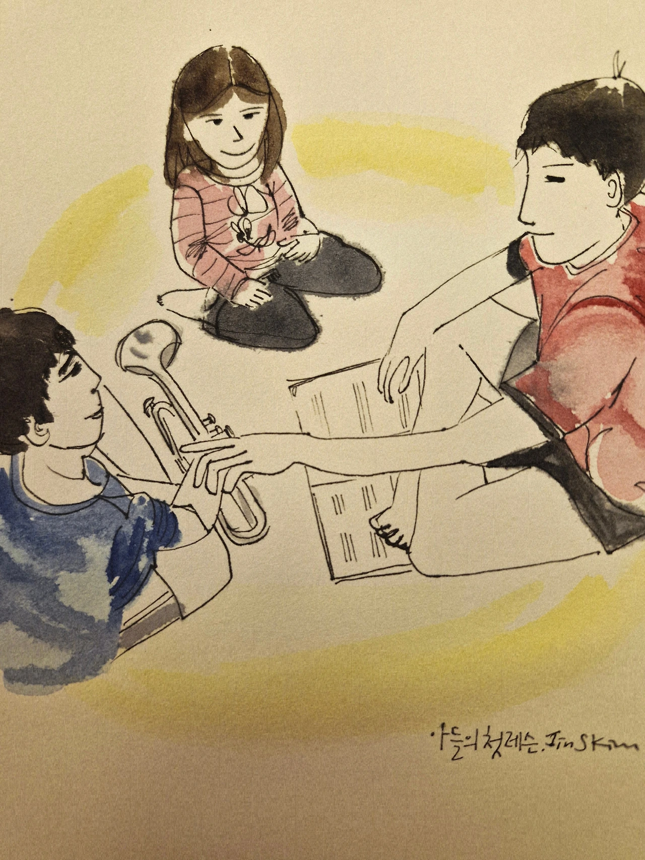 방학 때였는데 중학생이던 큰아들이 자발적으로 동생에게 트럼펫을 한번 가르쳐줄까요하고 운을 떼는거다.