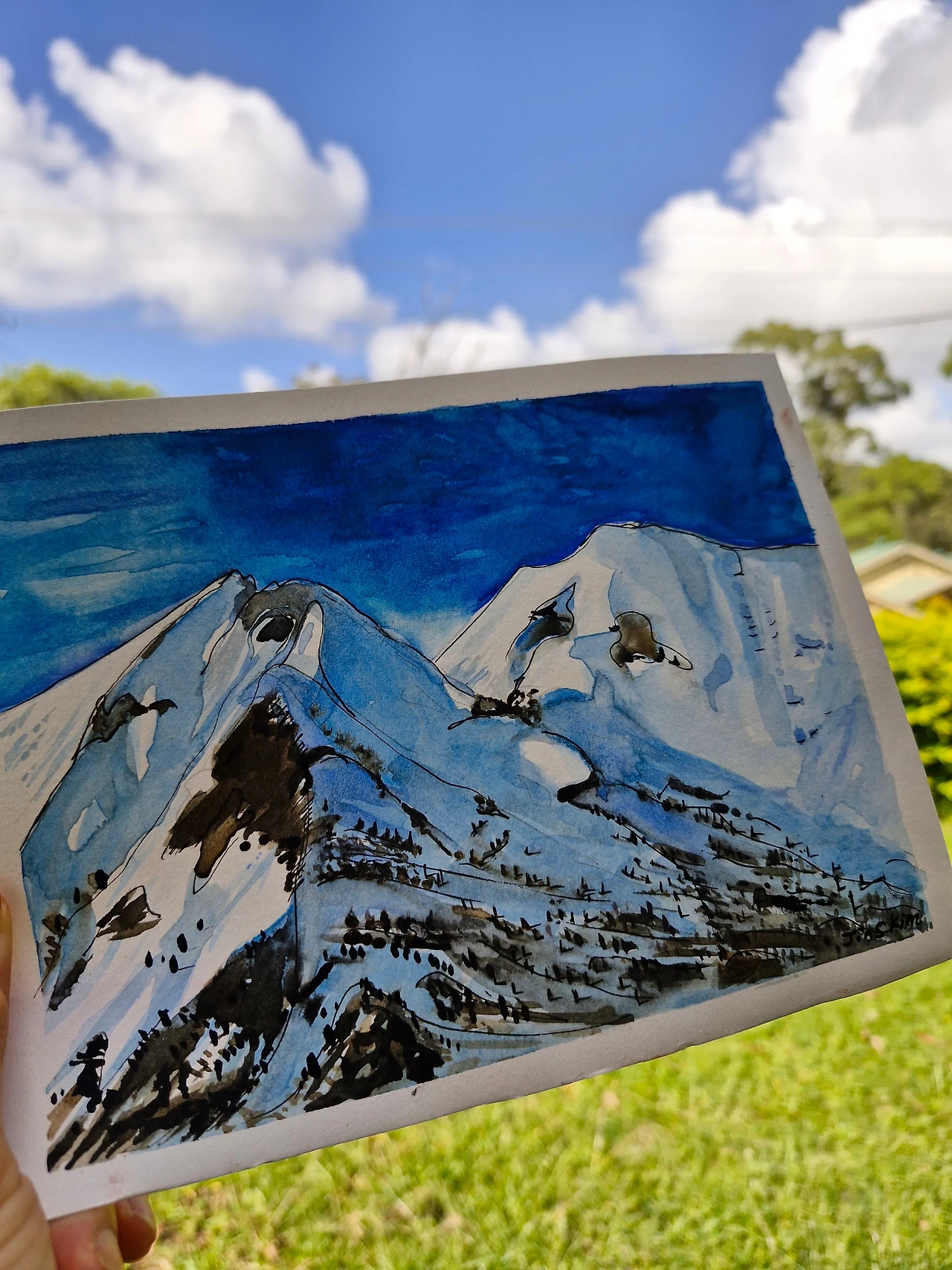 3월 초인데도 호주 한낮의 태양볕은 뜨겁다. 더운 날에 보기만 해도 시원한 겨울산을 그리니 몸과 마음이 다 시원하다. 수채물감으로 눈 덮인 산을 표현해 보는 게 쉽진 않다. 자꾸 하다 보면 늘겠거니 하고 있다.
