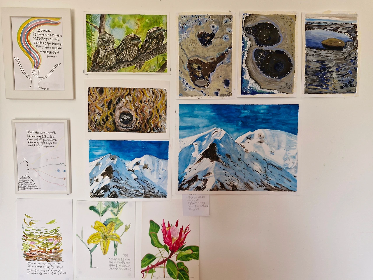 부엌옆에 있는 하얀 벽에 언제부턴가 그림을 한 장씩 그릴 때마다 붙여두고 진갤러리라고 부른다. 방문하시는 손님들이나 식구들이 관람객의 전부이지만 그러면 어떤가? 가끔 맘에 드는 그림 앞에서 오래 머무는 분도 있었고, 또 그림 앞에서 꽤나 긴 대화를 나누는 일도 있기에 내겐 참 소중한 공간이다.