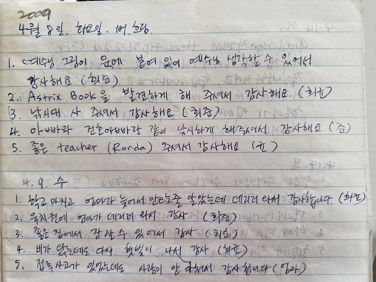 정말 간단한데 쉽진 않죠? 기록을 꾸준히 하는 게 참 어려운 일이에요. 찾아보니 제 감사노트의 시작은 2009년이었네요.. 아이들이 어렸으니 잠자리에 누워서 한 사람씩 돌아가며 오늘 감사했던 거 3가지 말하면 제가 노트에 적는 식으로 시작했어요.
