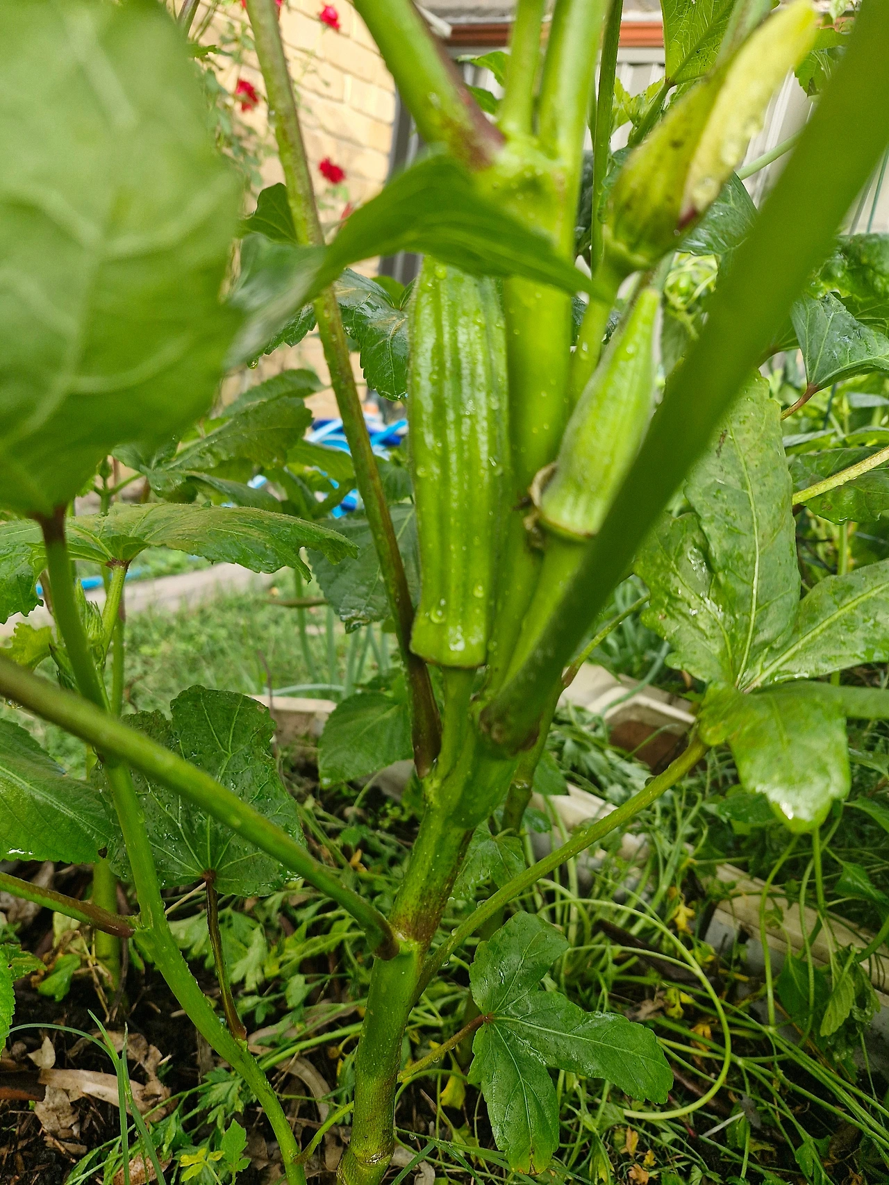 며칠 내내 퐁퐁물로 스프레이를 잎마다 꽃마다 뿌려가며 겨우 살려낸 분들입니다. 이 날은 첨으로 오크라가 달린 것을 봤네요. 아, 이렇게 자라는군요. 언제 따야 되는지, 어떻게 요리해야 하는지도 몰라서 검색해 봐야 할 정도로 낯선 분입니다.