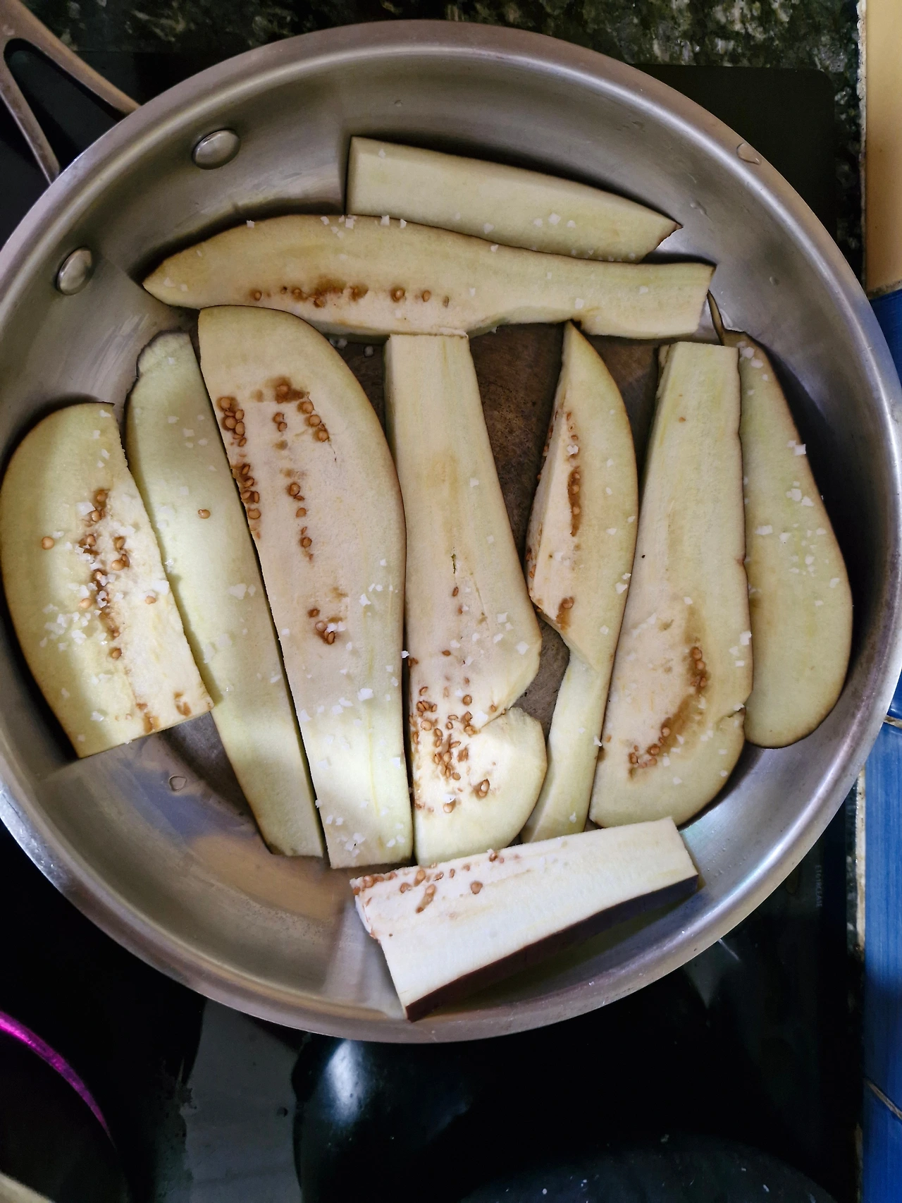 -가지를 길고 얇게 잘라 소금 뿌려 살짝 둔 다음에