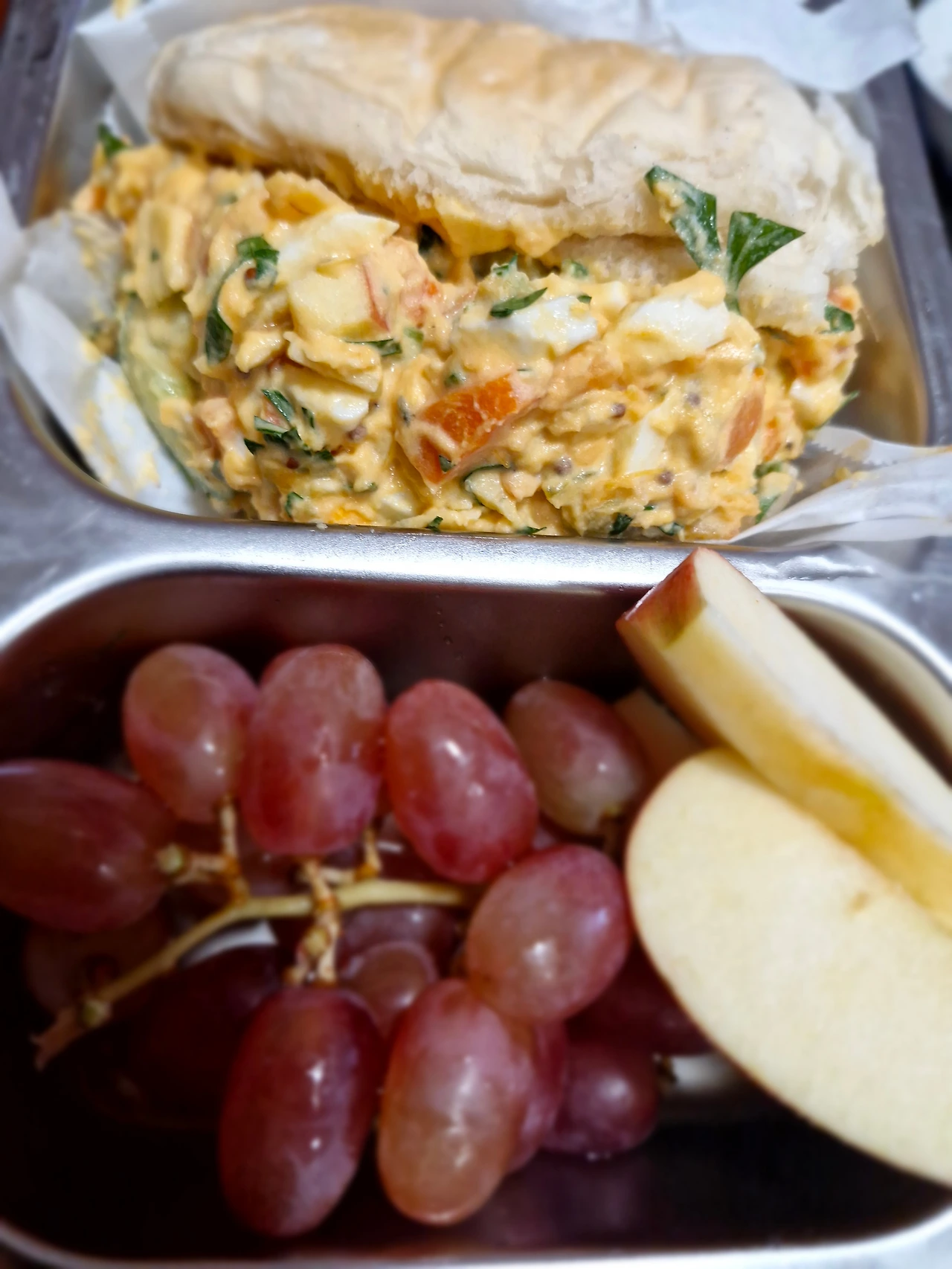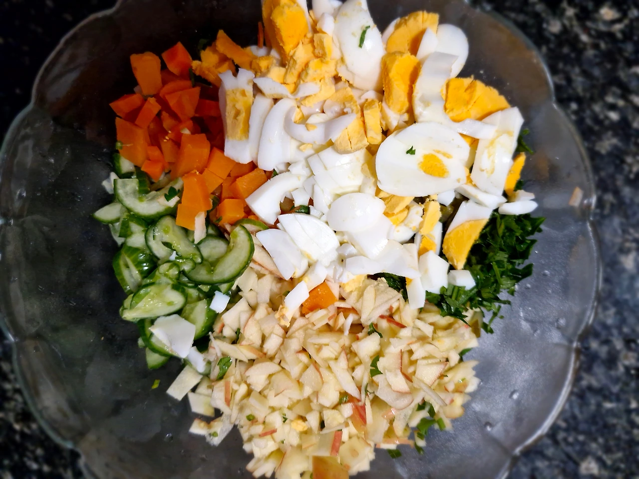 -오이 피클 한 개, 사과 반 개는 냉장고에 있어서 넣었어요(집에 있는 다양한 재료 추가 가능; 건포도, 적양파, 견과류....)