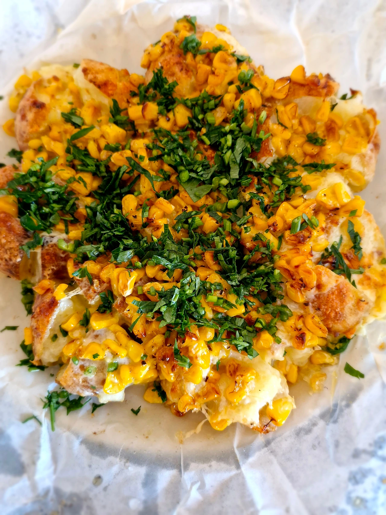 -동그랗게 케이크틀이나, 파이틀 위에 동그랗게 놓고 열십자를 깊이 내어, 버터에 볶은 옥수수와 치즈를 올린다.