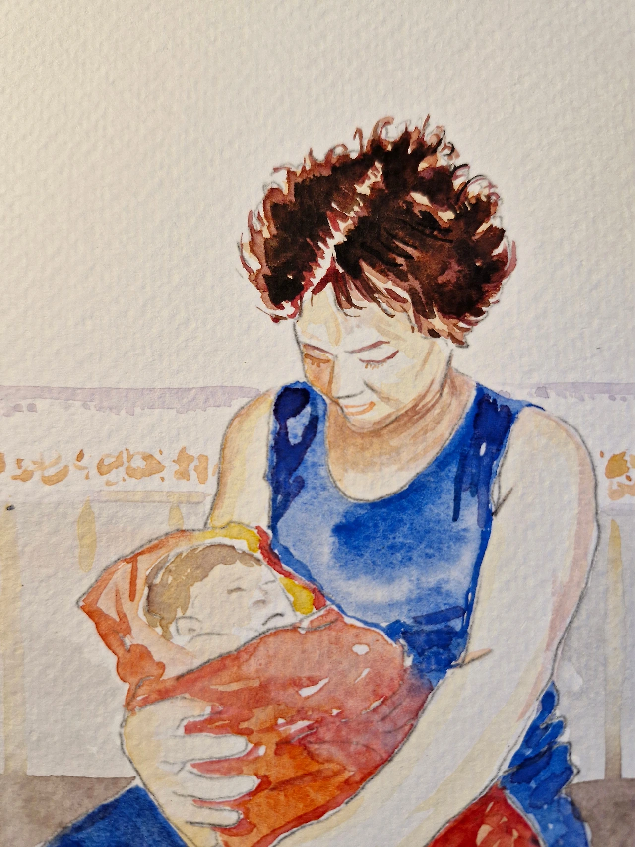 전화를 끊고 나서 마음이 뭉클해졌다. 책상 위에 마침 어제 시작한 그림이 눈에 들어온다. 우연일까 특별한 끌림이었을까. 왜 그 많은 사진 중에서 어머니가 갓 태어난 첫손주인, 너를 안고있는 모습을 그리고 싶었을까. 그림 속의 울 어머니는 아름답고 생생하시네, 너는 너무 작은 아가이구.