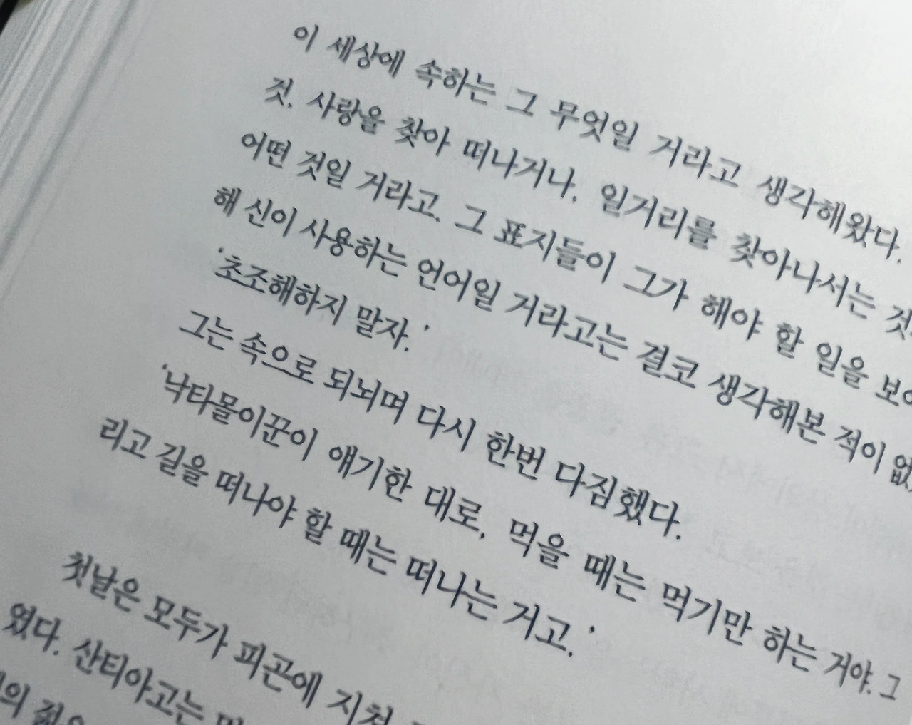 자아실현에 있어 중요한 것은 이토록 평범함으로 무장한 채 오는 귀인을 잡는 것이고, 결국 귀인으로 가장한 나의 내면의 소리를 듣는 것이다. 그러나 마음 깊숙한 곳에 있는 지표를 숨기고 우리는 팝콘 장수처럼, 크리스털 가게 주인처럼 나중을 기약하는 삶을 산다. 지금의 안정을 위해서. 그렇기에 2022년에 여행을 떠나는 어떤 산티아고를 걱정하는 것도, 어쩌면 걱정을 가장한 부러움일지 모른다.