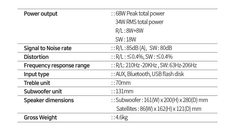 B회사의 스피커 스펙이다. 아마도 스피커에 대해서 아는 사람이라면 이 설명을 보고 가격대를 알아낼 수 있다. 최대 출력이 68W이고 정격출력이 34W이며 주파수 범위가 최대 20kh이고 우퍼가 63hz의 베이스 음을 구현할 수 있다. 피시용 스피커로 제격인 제품으로 10만 원 안쪽의 제품인 것이다.