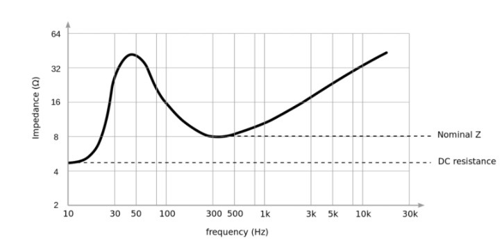 임피던스가 낮으면 저항 성분이 작기 때문에 전류가 흐르기 쉽고, 임피던스가 높으면 전류가 흐르기 어렵게 된다. 공칭 임피던스(Nominal impedance)를 적어 놓은 스피커 스펙의 임피던스를 보면 4Ω, 8Ω 등으로 적혀 있다. 그러나 스피커 임피던스는 고정 값이 아니고 그림 같이 주파수에 따라 그 값이 변한다. 그림의 스피커의 임피던스는 주파수에 따라 변하게 되는데 40Hz 부근에서 최대가 된다. 이 부분을 스피커의 공진 주파수라고 부른다. 이 주파수 영역을 지나면서 400Hz 부근에서 임피던스가 최저값이 되는데 이 값을 스 피커의 공칭 임피던스(Nominal Impedance)라고 부른다. 따라서 그림의 스피커의 공칭 임피던스는 8Ω이다.