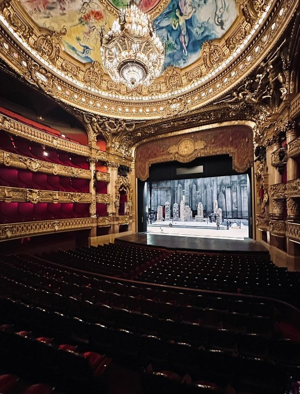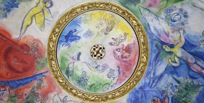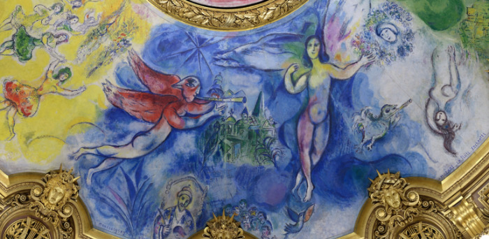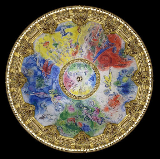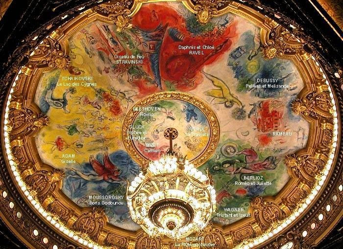 마르크 샤갈이 그린 프레스코 천장화는 14개의 유명한 오페라의 장면을 묘사하고 있다. 중앙 원형에는 4명의 위대한 작곡가 비제와 카르멘(빨간색), 베르디와 라 트라비아타(노란색), 베토벤과 피델리오(녹색), Gluck, Orpheus 및 Eurydice (파란색)을 그렸다. 밖의 원형 패널에는 차이콥스키의 백조의 호수 (노란색)와 스트라빈스키의 불새 (파란색)를 포함하여 추가로 10명의 작곡가를 커다란 삼각형의 면을 그리고 그 안에 2명의 작곡가를 그려 넣었다. 프랑스 파리 오페라 가르니에 극장의 천장화의 또 다른 이름은 ‘꿈의 꽃다발’(Bouquet de rêve)이다.