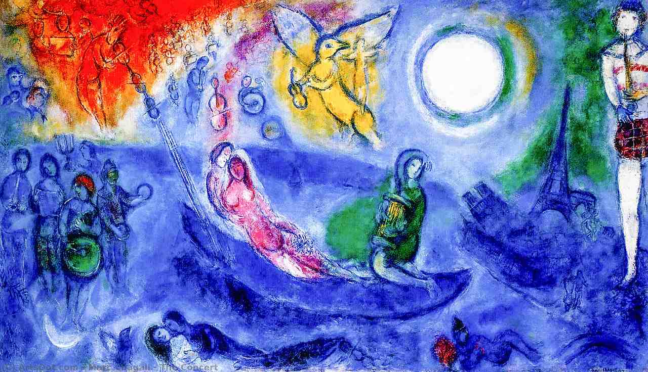 이고르 스트라빈스키(IgorStravinsky)의 '불새'(The Firebird, 1910) 피날레(Finale)와 어울린다. 왕자 이반이 불새의 힘을 빌려 카체이의 저주를 깨뜨린 후, 새로운 왕국의 탄생을 알리는 장면. 현악기의 잔잔한 서주에서 시작해 점차 빛나는 관현악의 파노라마로 확장되며, 궁극적으로 환희와 해방의 절정으로 치닫는다. 불새의 신비로운 아름다움과 초월적 힘을 동시에 표현하며, 샤갈 특유의 “신화적 색채에 인간 영혼의 해방”이라는 주제와 잘 겹친다.