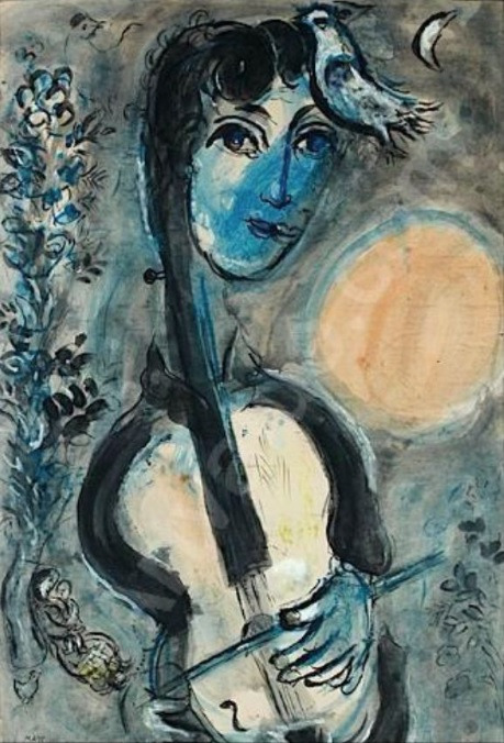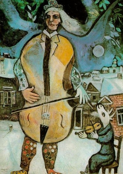 샤갈(Marc Chagall)의 작품 세계에서 현악기, 특히 바이올린은 자주 등장하지만, 첼로는 상대적으로 드문 편이다. 샤갈의 회화 속에서 바이올린 연주자(‘떠다니는 바이올린 연주자’, ‘푸른 바이올리니스트’ 등)는 유대인 마을의 삶과 종교적 의식을 상징한다. 악기는 단순한 연주 도구가 아니라 향수, 고향, 종교적 영성, 인간의 내면적 울림을 표현하는 매개체로 '꿈과 현실을 연결하는 다리'로 그려진다.
