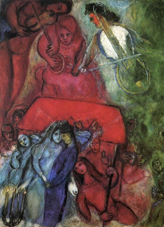 1950년 샤갈은 작품 '신부'(The Bride)에서 하얀 면사포를 쓰고 스칼렛 색상의 웨딩드레스를 입고, 부케를 들고 있는 신부를 그렸다. 염소가 결혼을 축하하는 첼로 연주 울려 퍼지는 몽환적인 작품이다.