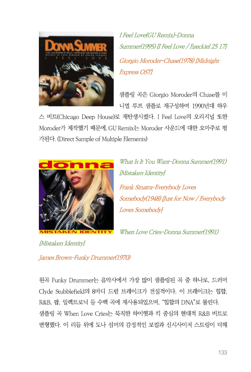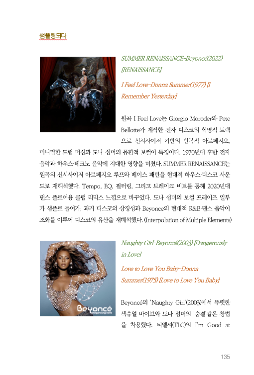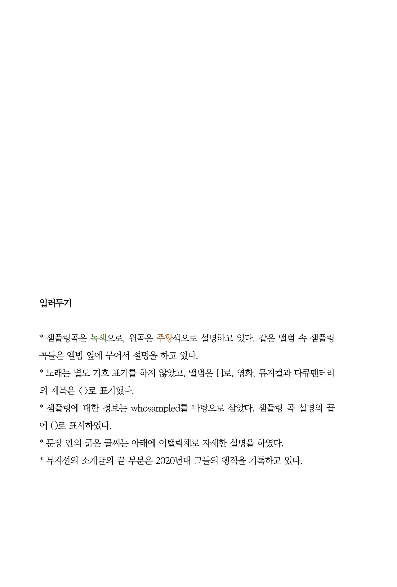 이 책은 “샘플링을 통해 대중음악의 계보를 시각적으로 아카이빙 한 연구형 교양서”다. 단순히 읽히는 책이 아니라, 보고 넘기며 축적되는 책이기를 바랐다. 그래서 미색지를 사용해 가독성을 높이고, 종이의 질감을 한 단계 올렸다. 잡지처럼 세련되면서도, 자료집처럼 신뢰가 가는 인상을 주고 싶었다.