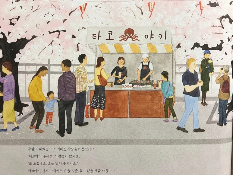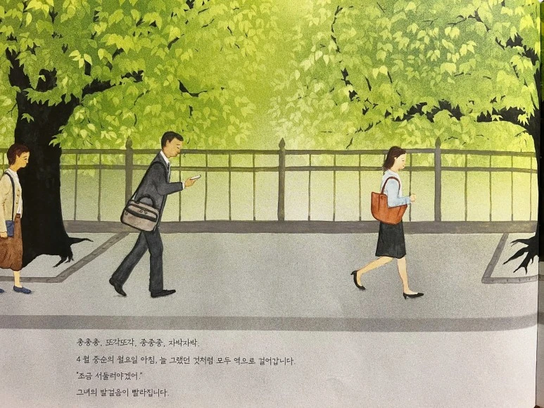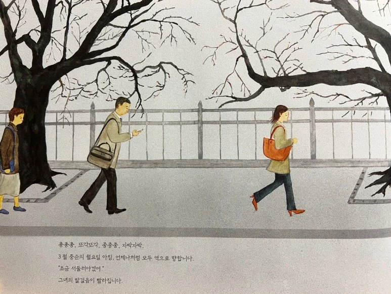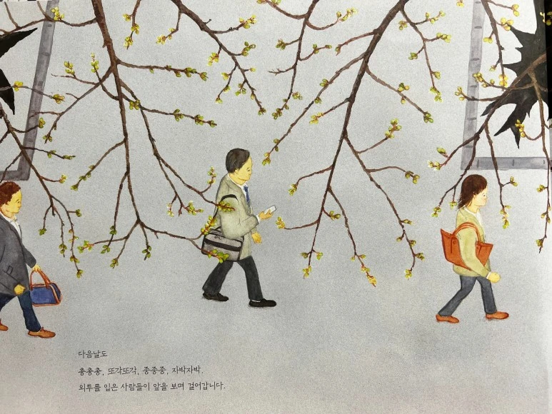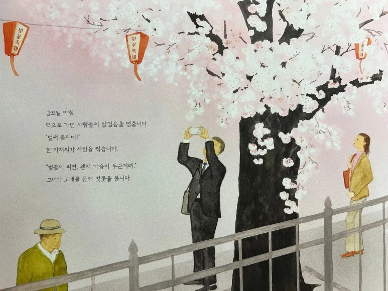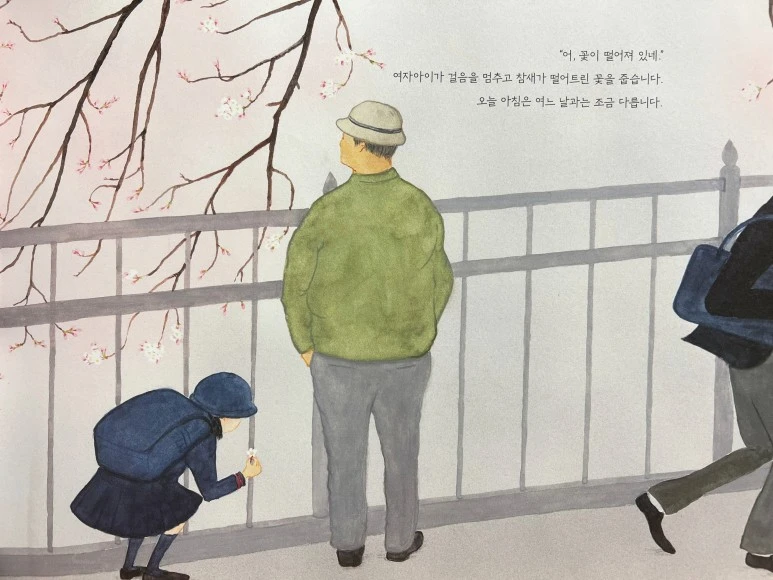 느릿느릿 걷던 여자아이가 가장 먼저 봄이 왔음을 알아챘네요! 그 옆에 주머니에 손을 꽂고 있는 할아버지도 벚나무를 바라보고 있고요. 역시 '봄'은 마음이 여유로운 사람에게 먼저 찾아오는 법입니다.