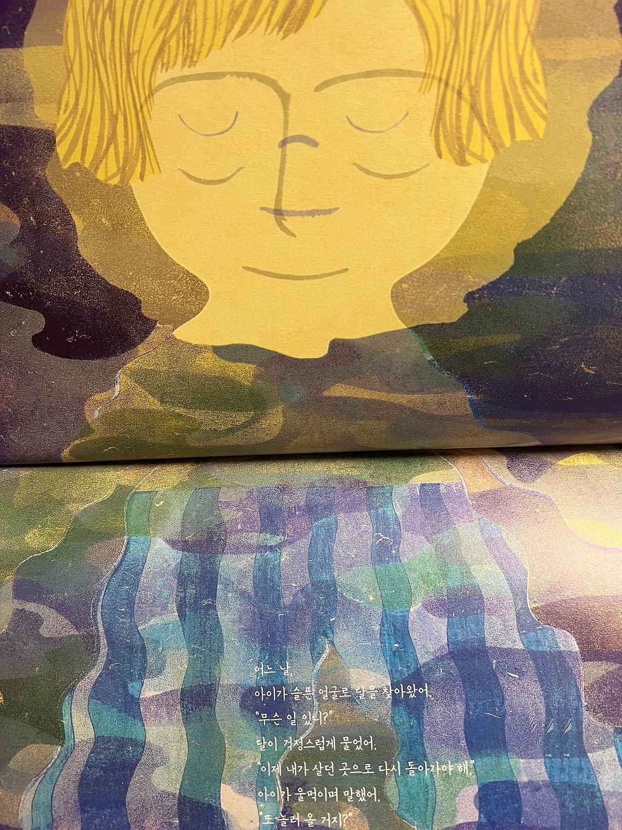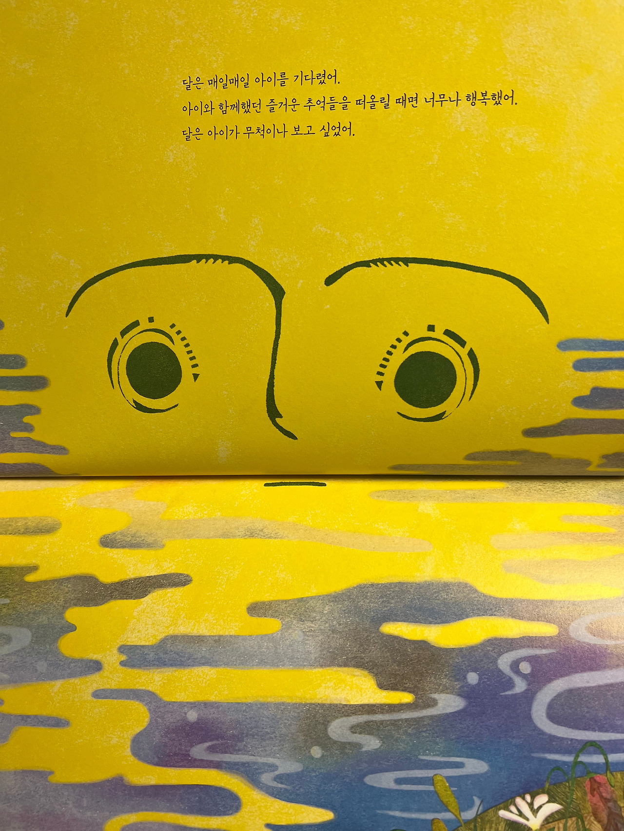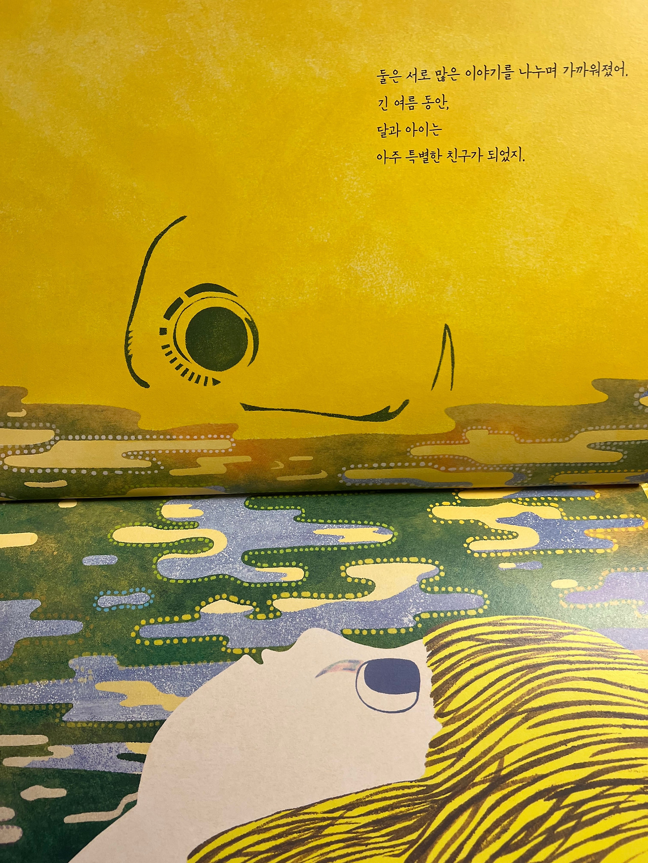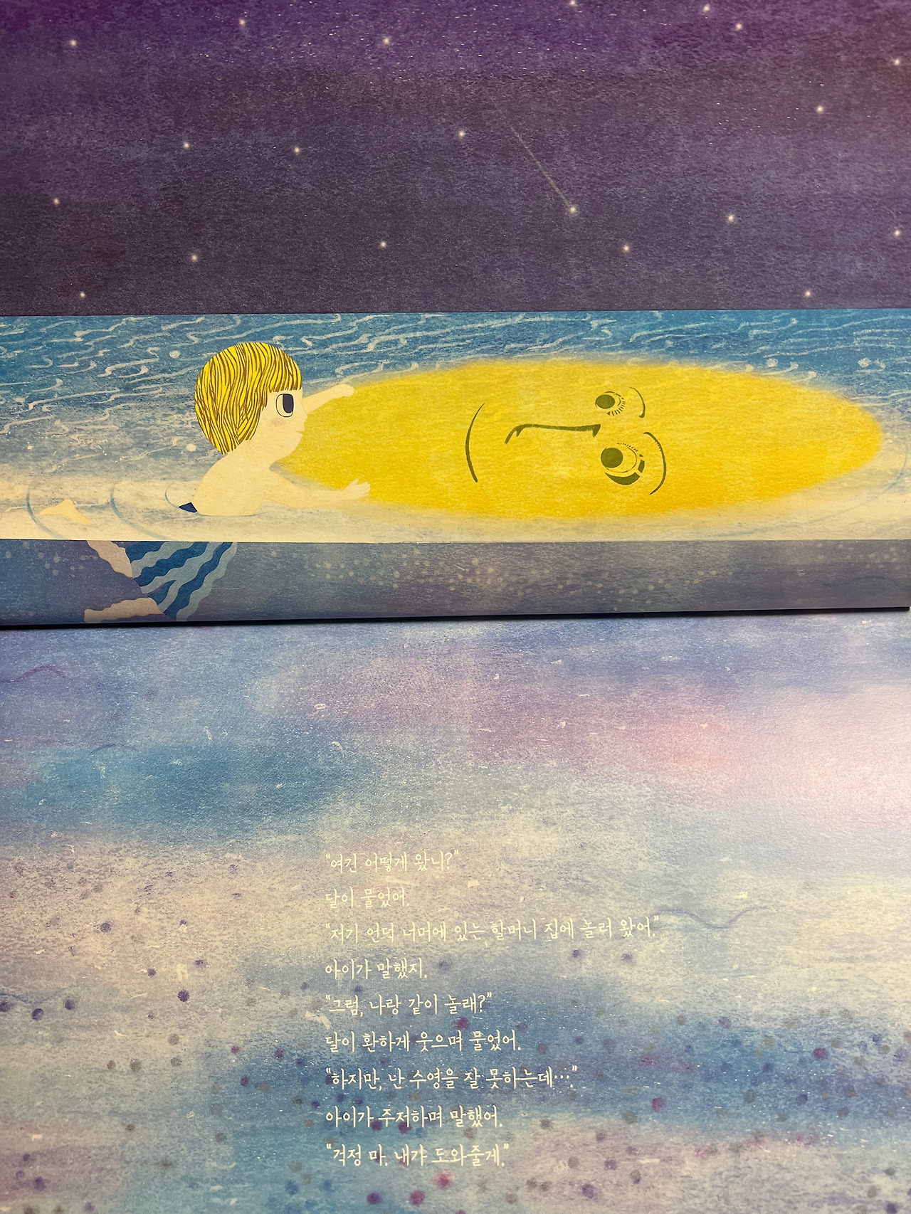 "여긴 어떻게 왔니?" 달이 물었습니다. "저기 언덕 너머에 있는 할머니 집에 놀러 왔어." 아이가 답했습니다. "그럼, 나랑 같이 놀래?" "하지만 난 수영을 잘 못하는데…." "걱정 마, 내가 도와줄게." 달이 다정하게 말하며 아이를 감싸 안았습니다. 긴 여름 동안, 달과 아이는 서로 많은 이야기를 나누며 가까워졌습니다. 아주 특별한 친구가 되었지요.