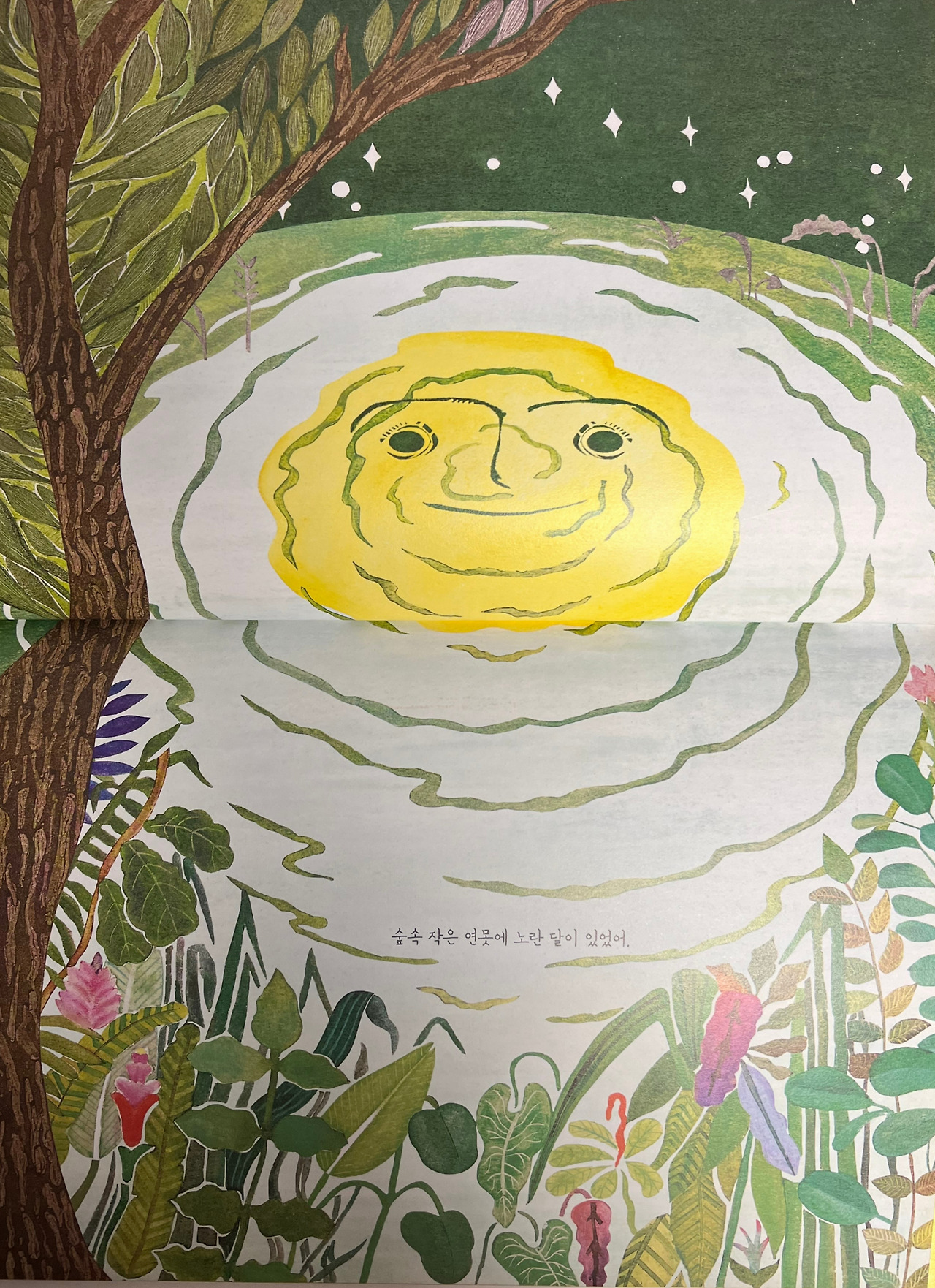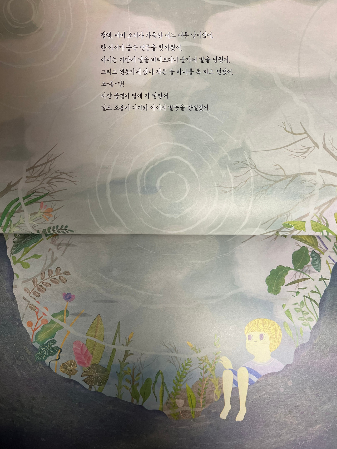 숲속 작은 연못에 노란 달이 있었습니다. 가끔 잠자리, 개구리 친구들이 놀러 왔지만 잠시 머물다 떠나가버렸습니다. 그러던 어느 여름 날, 한 아이가 숲속 연못을 찾아옵니다. 아이가 연못가에 앉아 작은 돌 하나를 톡 하고 던지자 하얀 물결이 달에 가 닿았습니다. 달도 조용히 다가와 아이의 발등을 간질였죠.
