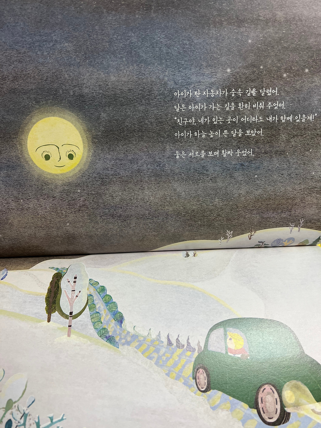 구름이 걷히고, 달은 어느 집 앞에 그려진 자신의 얼굴을 보았어요. 아이도 자신을 기억하고 있었다는 사실에 달은 무척이나 기뻤습니다. 그리고 아이가 자동차를 타고 가는 길을 환히 비춰 주었지요. "친구야, 네가 있는 곳이 어디라도 내가 함께 있을게!" 아이는 하늘 높이 뜬 달을 알아챘고, 둘은 서로를 보며 활짝 웃었습니다. 달도 아이도 이제는 외롭지 않습니다. 둘은 언제까지나 서로의 마음속에 있으니까요.