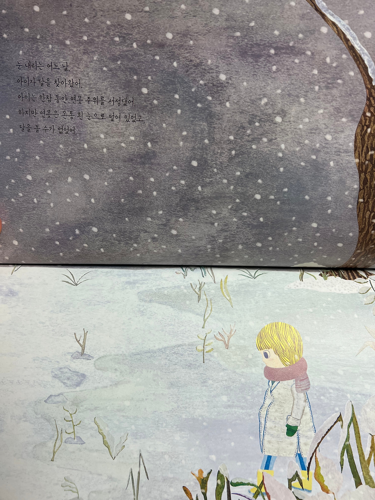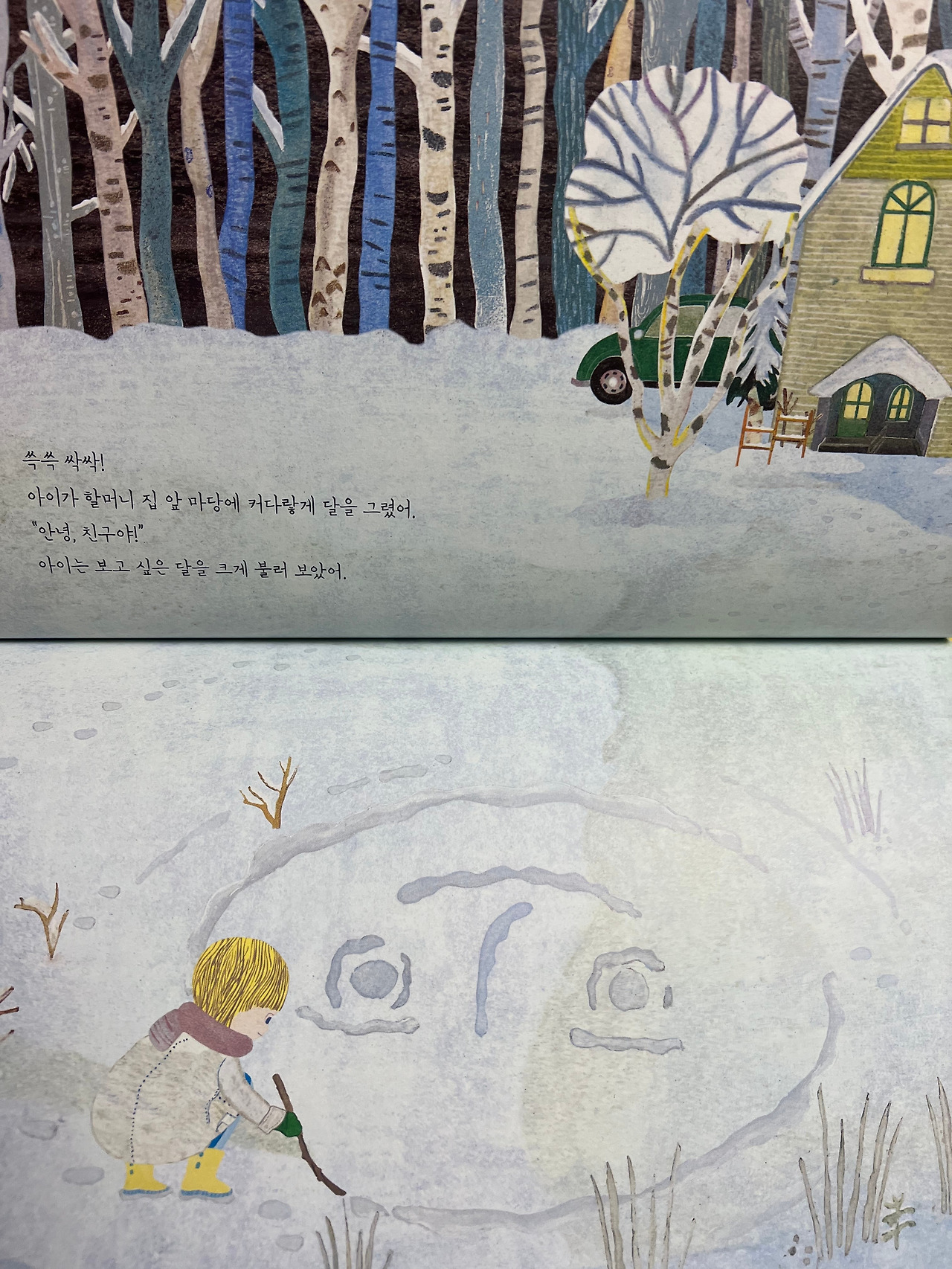 하얀 눈이 소복이 내리던 어느 날, 아이가 달을 찾아왔습니다. 하지만 연못이 온통 흰 눈으로 덮여 있어서 달을 볼 수가 없었지요. 할머니 집 앞 마당에 보고 싶은 달을 커다랗게 그리고 불러 보기도 했어요. "안녕, 친구야!"