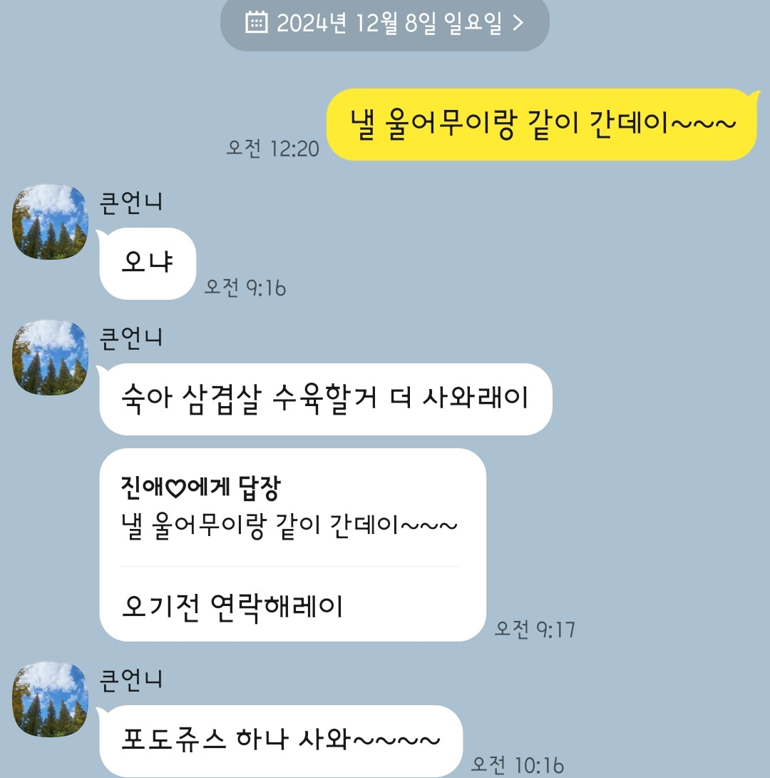 시어머니의 언니인 큰 이모님이 "니는 사돈 김장에 왜 가냐"며 나무랐다고 한다.그 말이 영 이상한 건 아니지만 어머니는 우리사돈 하고는 괜찮다며 개의치 않았다. 우리 시어머니는 용감하다. 용감한 시어머니를 친정도 반갑게 맞이한다.오히려 내가 더 좋을 수도.