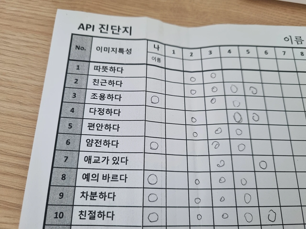 API진단도 처음 해보았다. 30가지 문항이 있는데 내가 생각하는 나의 이미지와 다른 사람이 보는 나의 이미지에 대해 체크한다. 긴가민가 한 건 체크하지 않았다. 체크를 하고 보이지 않게 접은 후 한 사람씩 표시하고 또 접는다. 다른 사람이 나의 첫 이미지에 동그라미 한 걸 보고 의아한 부분도 있었고 이렇게 보이는구나라는 생각도 했다. 이지적이다. 유머, 배짱, 박력이 있다 부분에서는 나도 다른 사람도 체크하지 않았다. 이 부분을 보안하고 싶었다. 강사도 나에게 조금 더 내뱉어보라는 조언도 해주었다.