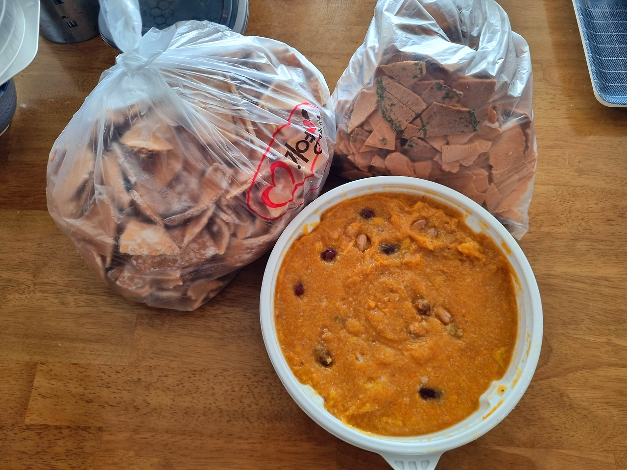 시어머니는 남편에게 결혼식 갔다가 가면 늦겠지?라는 말로 김장에 오지 못한 아쉬움을 전했다. 이 정도면 내 년에는 내가 먼저 김장한다고 통보를 해야 되나 싶다. 남편과 통화한 어머니는 사돈 아프다는 소리를 듣고 일요일 아침 호박죽과 시장 과자(사돈 입 심심할까 봐)를 우리 집에 가져다주고는 바로 결혼식장으로 가셨다.