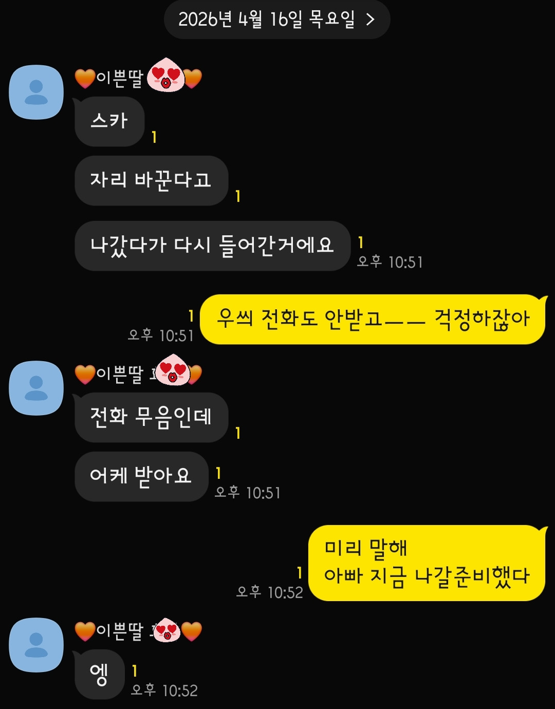남편이 나가려던 찰나 카카오톡이 왔다. 뒤늦게 부재중 전화를 확인한 아이가 가족단체톡방에 메시지를 남겼다.