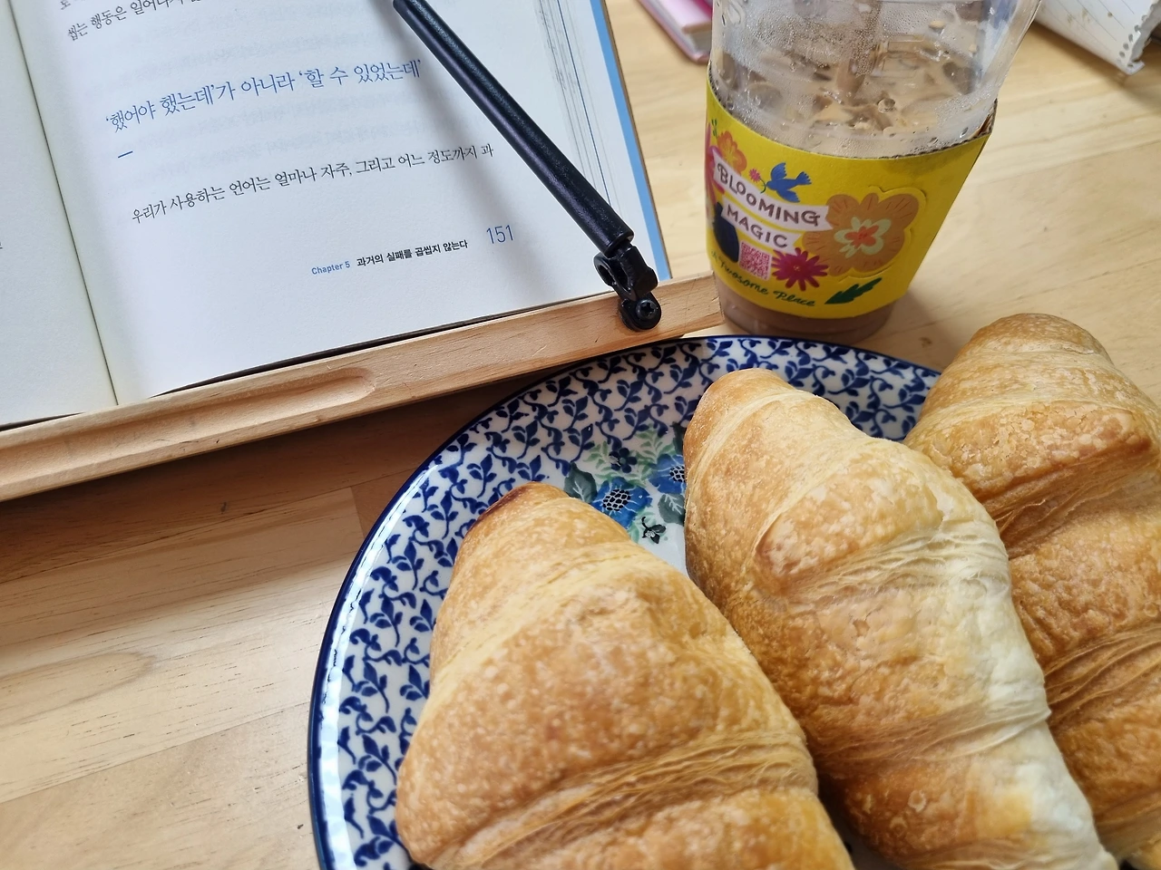 더위를 식혀줄 충분한 바람과 부드러운아이스라테커피 고소한 크로와상 빵 냄새가 온 거실을 가득 채운다. 그리고 보고 싶은 책이 있고 사랑하는 가족과 함께 있다. 현재 모든 것이 조화롭다. 더 바랄 것이 없는 지금이 좋다. 여기까지는 그 무엇도 부럽지 않은 더할 나위 없는 시간이었다. 너무 좋았는데.