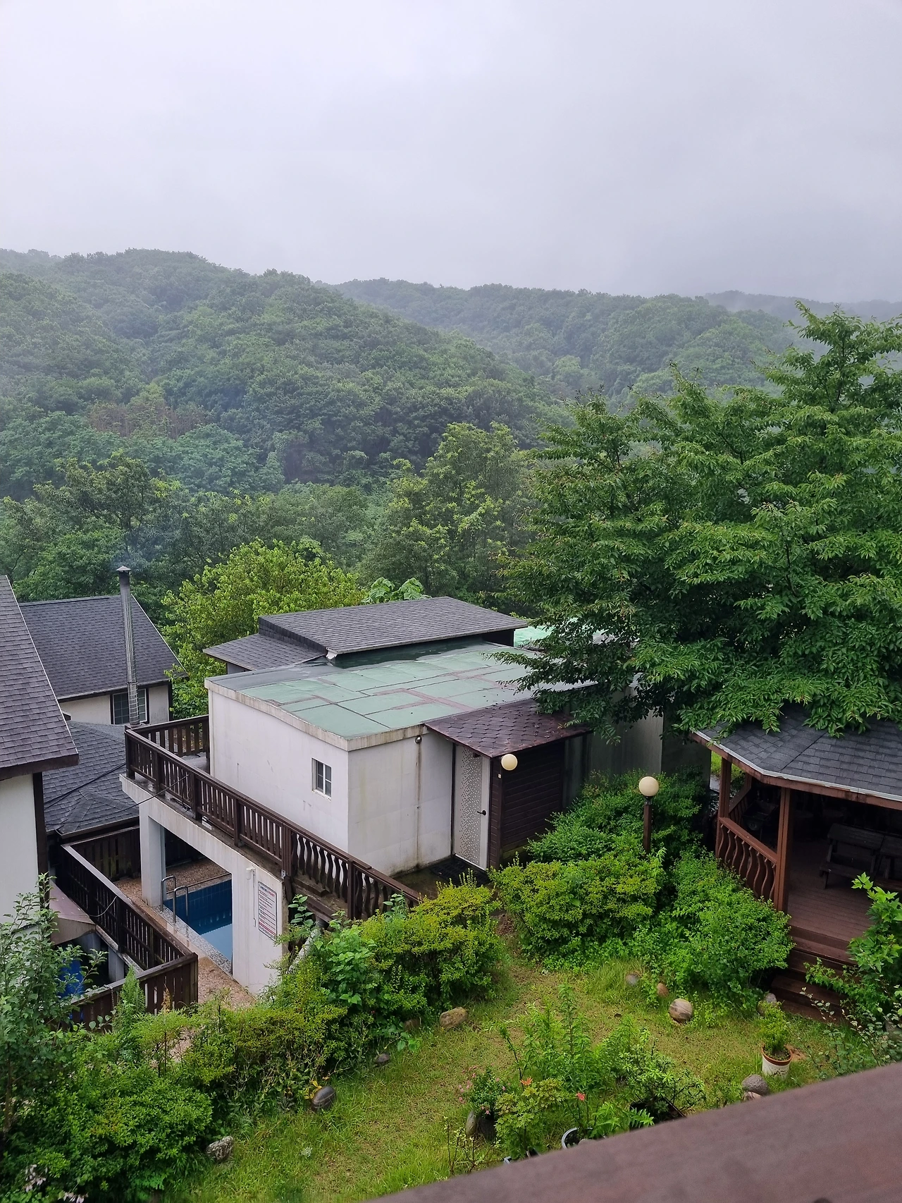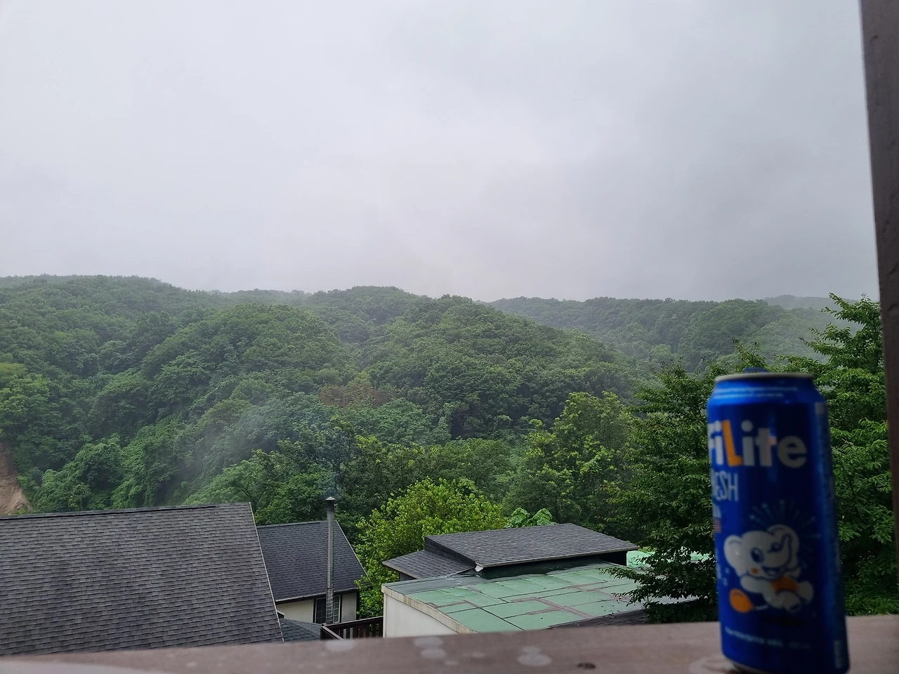 두 시간 동안 열심히 달려온 보람을 잠시 느껴보려 한다. 산세도 좋고 공기마저 코가 뻥 뚫리는 상쾌함. '딸깍'거리며 따지는 캔맥소리마저 경쾌하다. 목구멍이 타들어갈 만큼 한 모금 쭈욱 들이키며 타닥타닥 키패드를 두드린다. 비까지 부슬부슬 내리는 현재 지붕 위에 조용히 토독토독 거리는 울림이 내 마음도 열라며 노크 중이다.