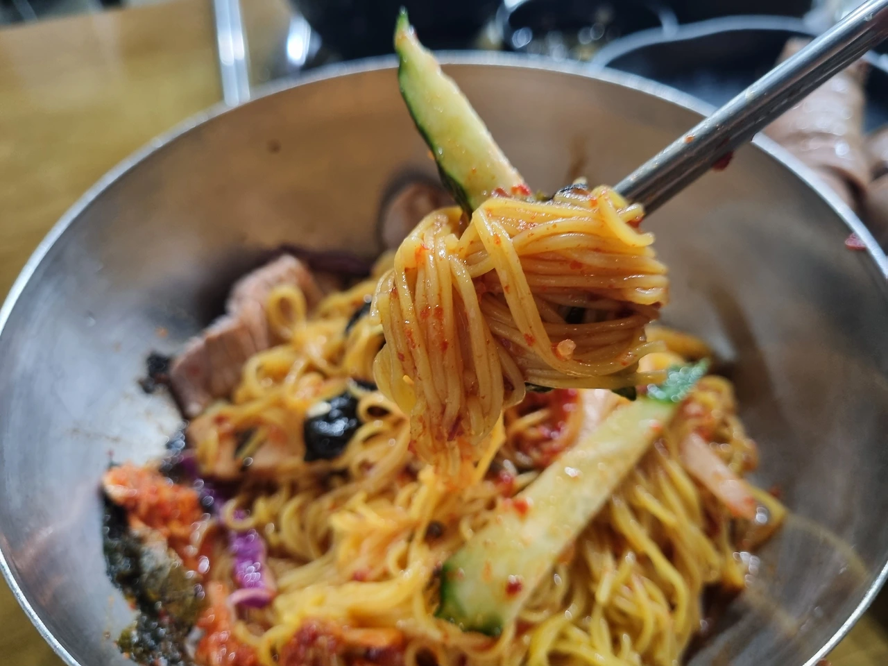 남편은 막창순대를 잘 먹었고 나는 고기 비빔국수가 입맛에 맞았다. 그리고 우리는 각자의 속도에 맞추자며 소주도 따로 시켰다.(이 주 전 남편속도 맞추다가 식겁했다)