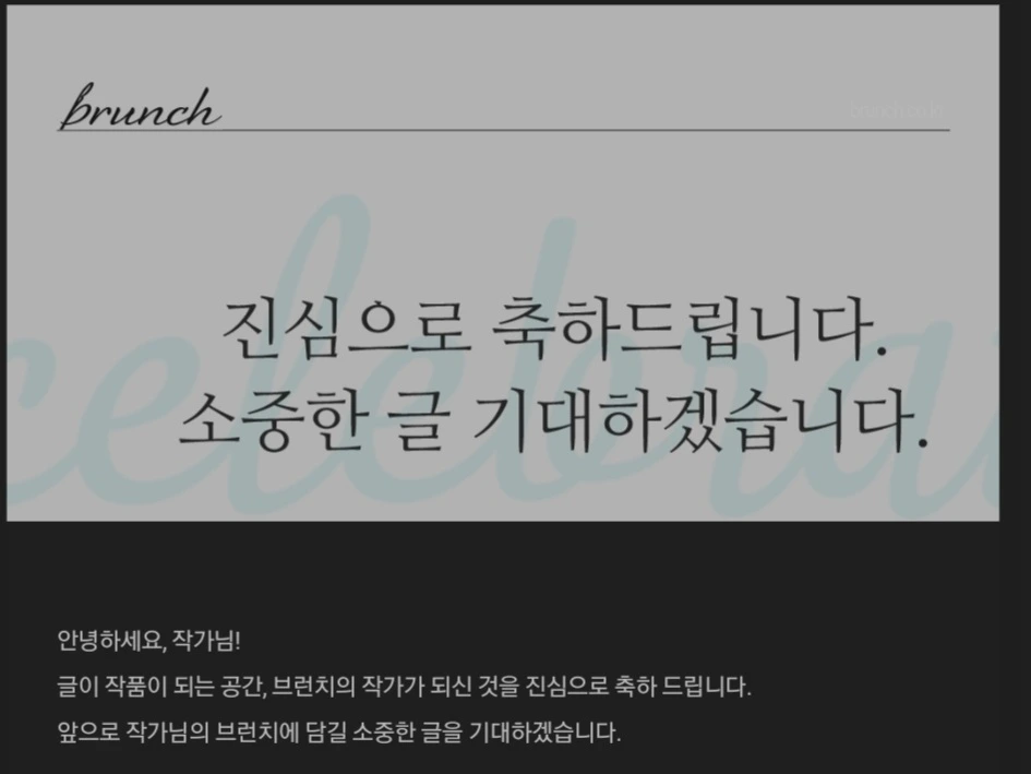 브런치에 도전하게 만들어준 슬기로운 초등생활 프로젝트에서 처음으로 내가 쓴 글에 칭찬을 해주셨던 분이다.단지 몇 마디 조언을 받았을 뿐인데 합격 가능성이 높아질 것 같다는 말에 너무 감격스러웠다. 그러나 목차를 조금 더 풍성하게 쓰라는 조언에는 그 영향을 미치지 못한 채 작가 신청을 해버린 거다. 그저 생전 처음 받는 글 칭찬에 이미 합격을 장담받은 것처럼 눈치 없는 입꼬리만 실룩 나대기 바빴다.
