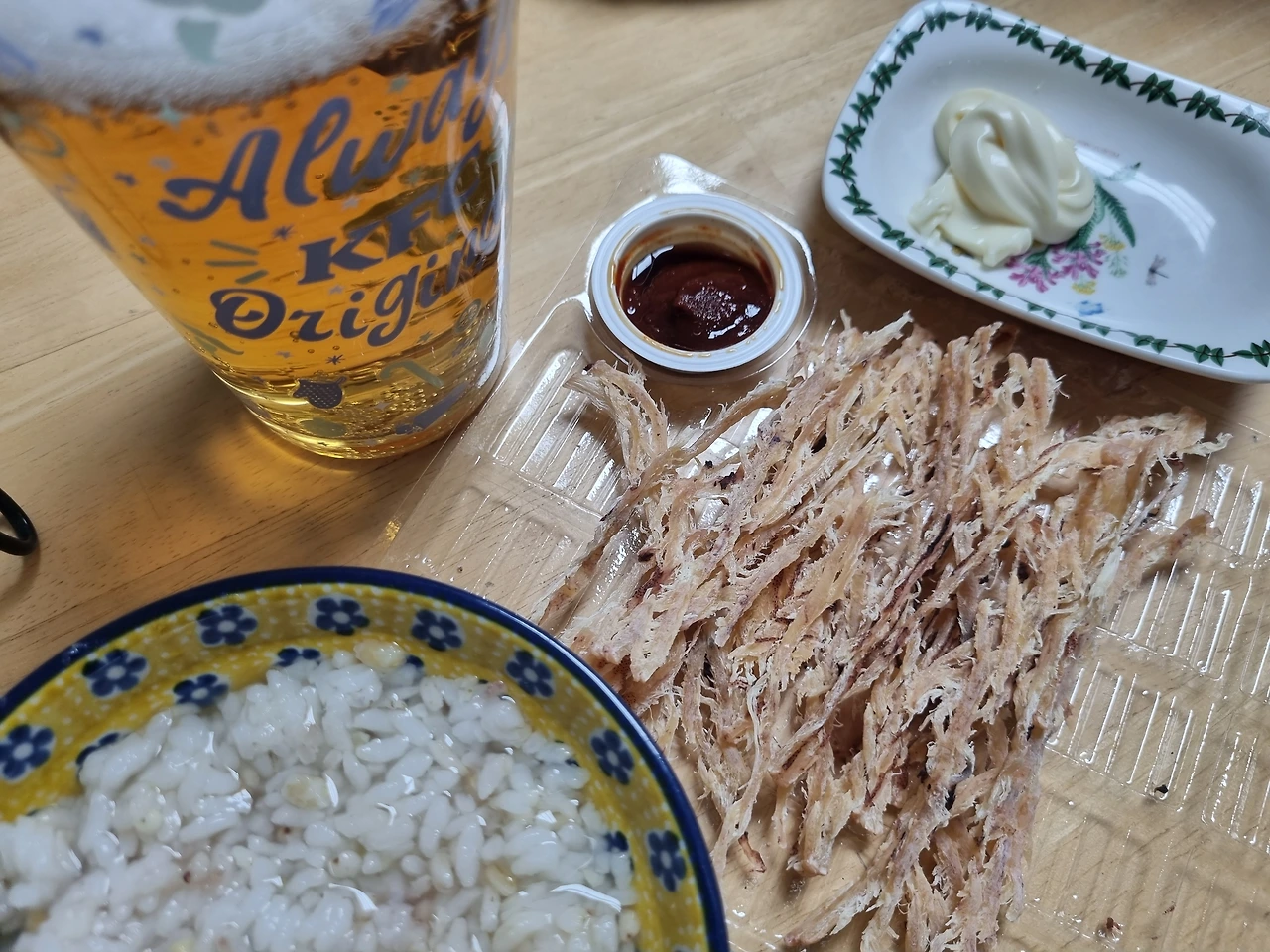 맥주 자체만으로도 배가 부르다. 그럼에도 생으로 술만 마실순 없으니 최대한 간단한 안주를 선호한다. 그리고 흔하디 흔한 물밥.(냉보리차를 부으면 더 맛있다) 이건 어디까지나 나의 개인적인 취향이다. 만인이 좋아하는 음식이 있고 각자의 독특한 개성이 담긴 메뉴가 있다. 이미 부른 배이지만 물밥 한입 머금은 후 숯불구이 쥐포하나 떼어내어 고추장 한번 마요네즈 한번 찍어 질겅 씹어먹는 순간만큼은 놓칠 수 없다.