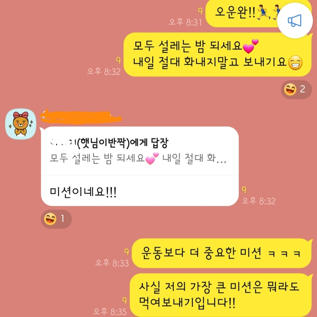 "신나고 설레고 걱정된다" "미치게 설렌다" "아홉 시에 재워야겠다"는등 심장박동 소리가 톡밖을 튀어나올 정도로 느껴지는 듯했다. 만보인증을 함과 동시에 모두 설레는 밤 되시고 내일 절대 화내지 말고 보내자는 메시지를 남겼다. 미션이 되었다. 이건 다른 이들에게 전하는 말이기도 하지만 나에게도 하는 말이기에 더 진심이었다. 그보다 더 중요한 미션이 남았으니 개인적으로는 아침밥이 아니더라도 뭐든 입에 물리기! 아이들이 학교에 가는 것도 설레지만 나부터 일찍 일어날 수 있을지가 더 걱정되고 긴장되었다. 그러려면 지금 이 글을 쓰고 있을게 아니라 한시라도 빨리 잠자리에 드는 것이 우선일 텐데 말이다.