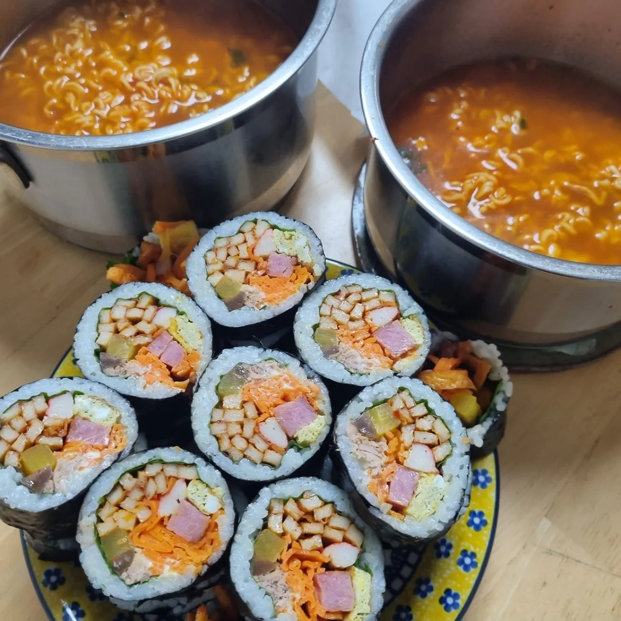 배가 두리뭉실하게 만져질 만큼 든든한 저녁을 먹었다. 갈수록 김밥 만드는 실력이 늘고 있는 남편은 한번 먹으면 자꾸 손이 가는 마성의 참치김밥을 만들어 낸다. 참치와 마요네즈로 살짝 느끼할 수 있는 부분을 매콤한 신라면으로 엇나가지 않게 잡아주었다. 그러니 배가 안 부를 수가 없다.
