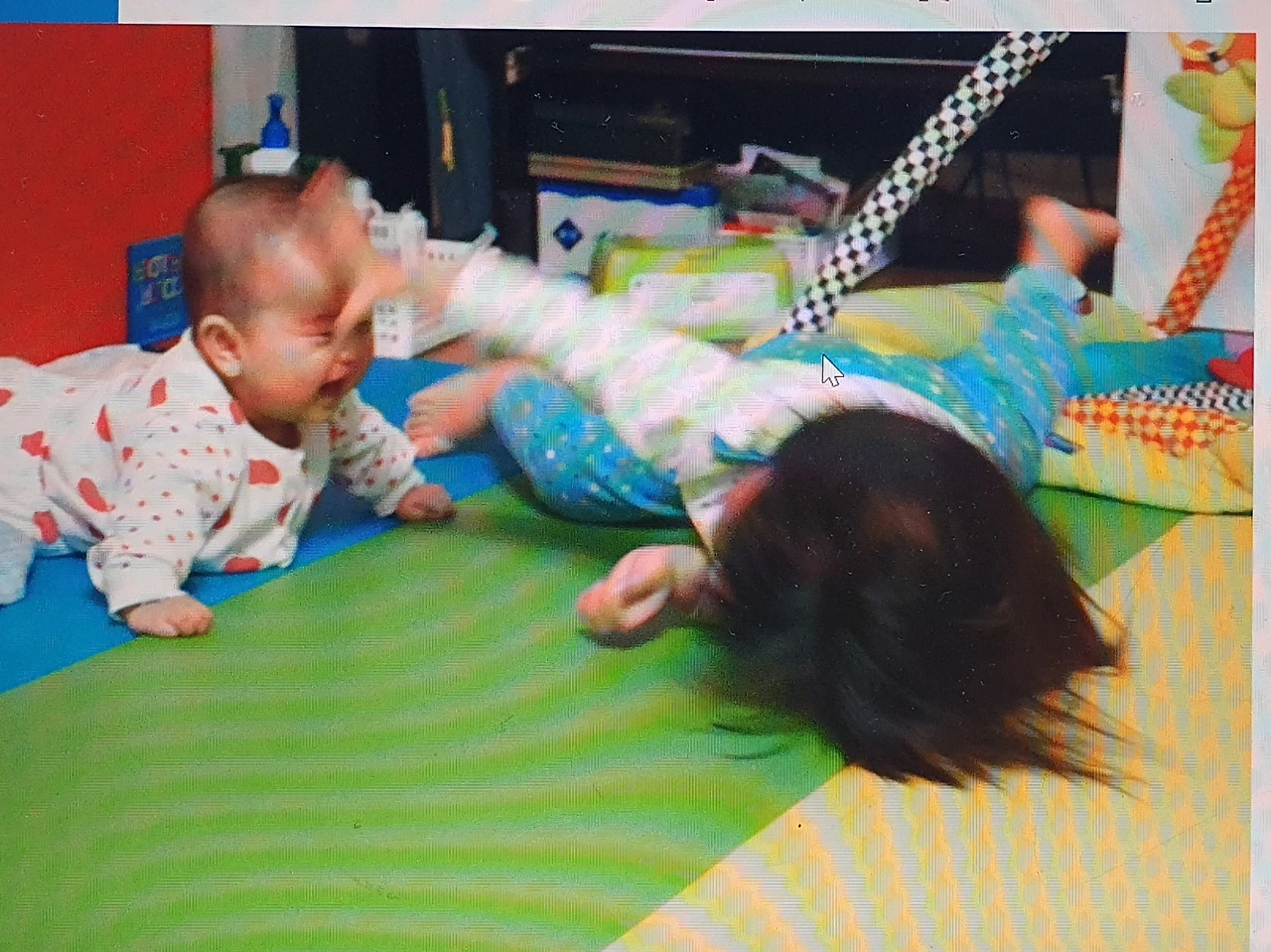 본인의 몸을 지탱하는 거라곤 겨우 뻗은 짧디 짧은 두 팔뿐인데 천방지축 세돌된 언니는 저 때 무얼 하고 있었을까. 옆으로 뱅그르르 돌다가 동생이랑 부딪히려는 순간이 포착되었다. 그 모습을 바라보는 둘째는 머가 그렇게 좋은지 앞으로 다가올 미래는예상하지 못한 채 세상 해맑은 표정으로 언니만 바라보고 있다.