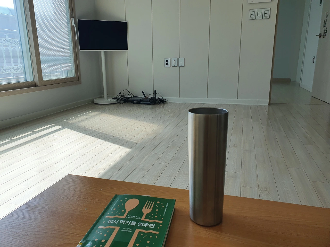 방문설치해 주시는 기사님을 만나러 독서도 할 겸 커피 한 잔과 함께 먼저 도착했다. 이사하기 전이라 아직 그렇다 할 물건들이 없으니빈 공간이 주는 공허함 그 자체만으로 그냥 앉아있어도 힐링공간이 되었다.