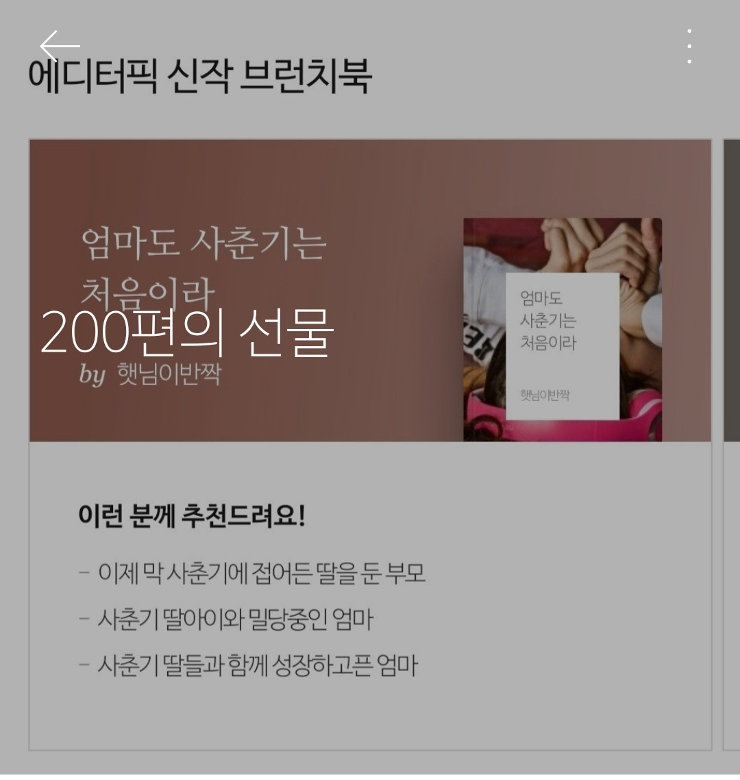 100개의 글을 발행할 때마다 수상소감하듯 적어냈다.100편에선 [발행은 용기다] 200편은 [200편의 선물]이라는 글을 올렸다. 시작은 늘 계속 쓸 수 있을까?라는 질문이다. 그보다 지금 무얼 쓸까 가 더 중요하다는 걸 안다. 오늘 한편 써내야 내일도 쌓아 나갈 수 있었다. 100편 200편이 될 때마다 그 뿌듯함은 이루 말할 수 없다.