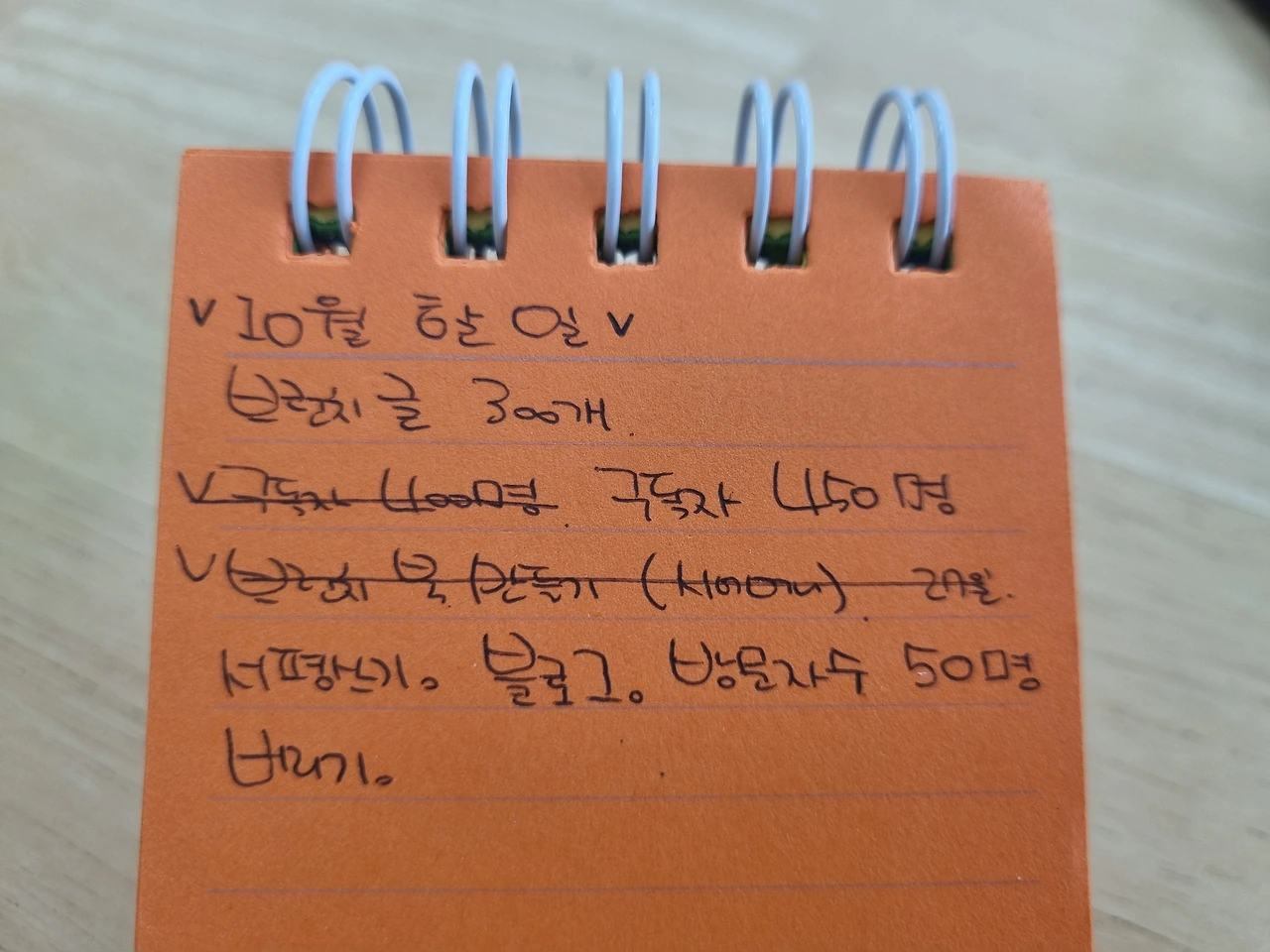 이번 달 유난히 축하받을 일이 많았다. 출간은일생일대의 일이다. 조회수 100만이 누적되고 오늘의 작가까지 이루는 복에 겨운 일들이 일어났다. 300편은 이번달에 달성해야 할 목록에 적어두었다. 영원히 선 긋는 일이 없도록 만들지 않는다. 할 수 있을 것 같은데 조금은 힘에 부치는 일들을 적어둔다. 한 줄씩 그을 때마다 '나는 할 수 있는 사람'이 된다. 이번 달에 이루지 못한 목표는 다음 달에 구독자 420명을 적어둔다. 해내지 못했다고 자책하지 않는다. 재미다. 목표도 중요하지만 오늘 하루 쓰는 과정을 즐기려고 한다.