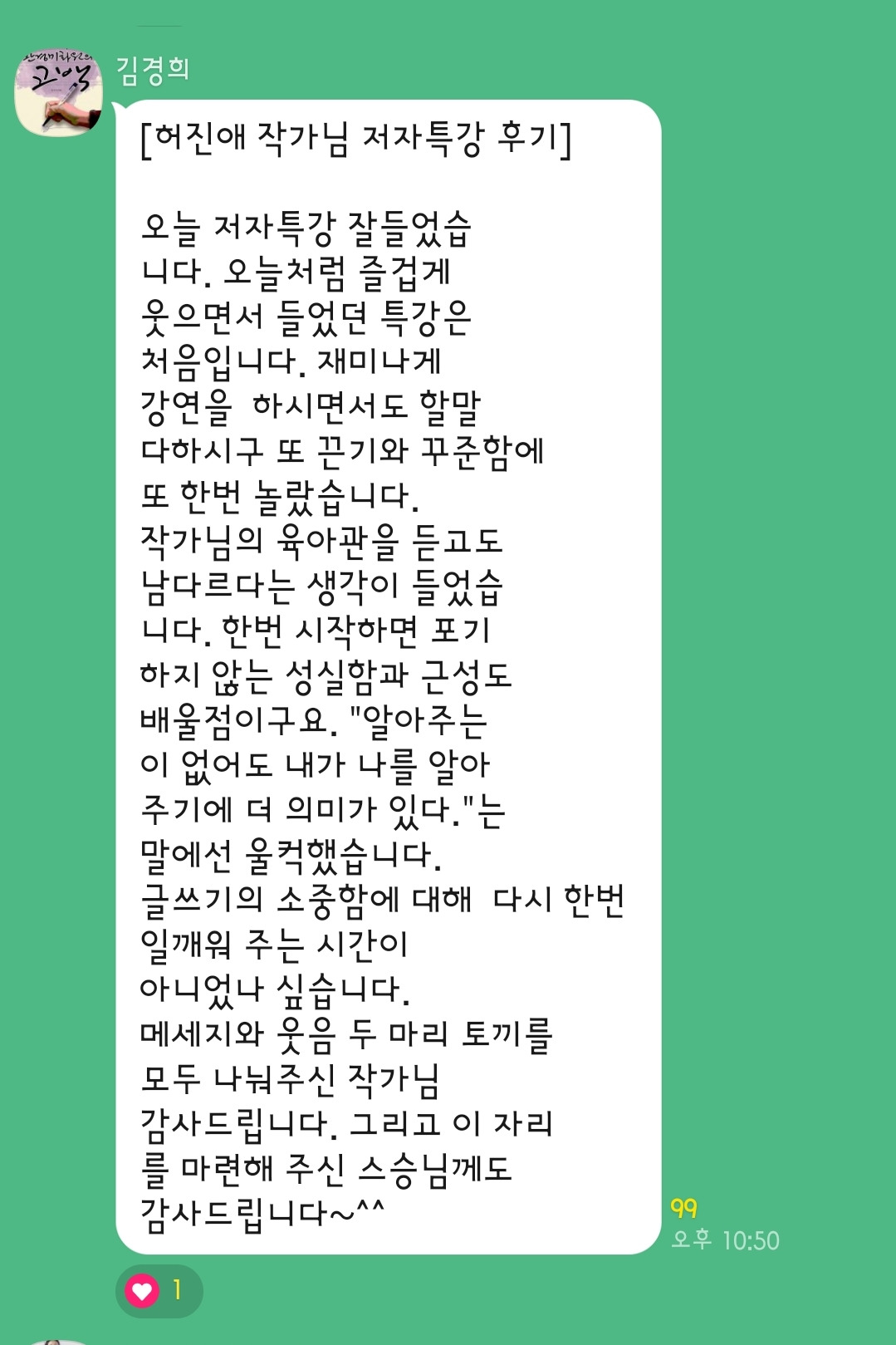화면에 보이는 글만으로는 부족했다. 휴대폰에 덧붙여 설명할 말을 적고 고치고 수시로 읽었다. 천천히 또박또박 읽으려고 애썼다. 하다 보니 조금 재미있는데라는 생각도 들었다. 그 미세한 느낌을 알아차리는 내가 좋았다. 깊은 내면에 강의를 하고 싶다는 생각도 작게 피어올랐다. 글쓰기도 하다 보니 출간으로 이어졌다. 말도 하다 보면 또 다른 꿈이 생길 것만 같아 특강을 진행하기로 했다.