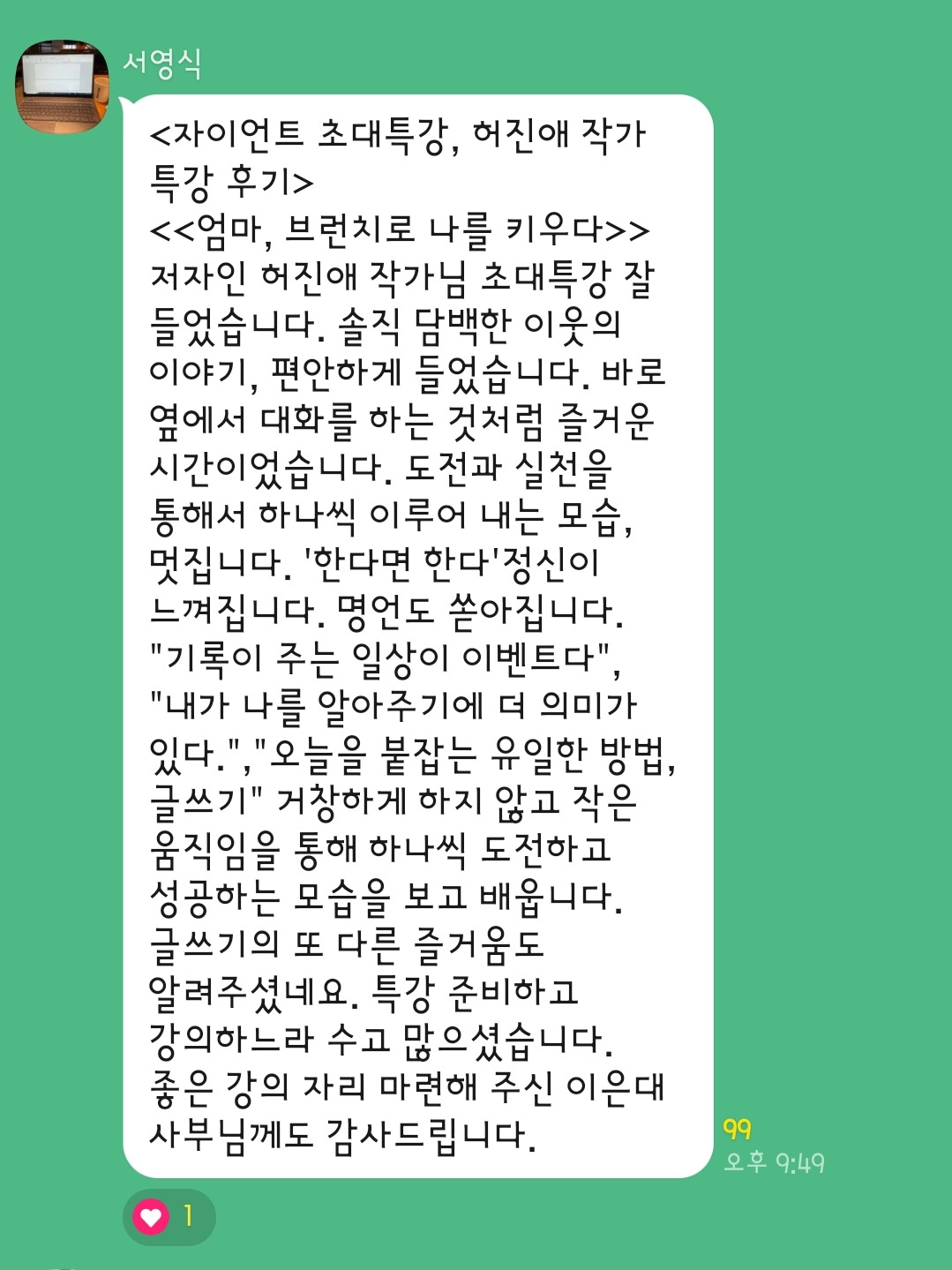 저자특강이 끝나고 머리도 식힐 겸 근처 공원으로 나왔다. 걸으면서 자이언트 작가들의 후기를 읽는데 한걸음 가고 멈추고 걷다가 또 멈추게 되었다. 많이 웃었다는데 작가들 얼굴 볼 겨를이 없었다. 이은대 작가가 화면을 캡처하여 보내주셨는데 작가들의 얼굴에 대부분 미소를 띠고 있었다. 바깥공기는 차가웠지만 가슴은 점점 더 뜨거워졌다. 안 했으면 어쩔뻔했어라는 마음의 소리가 울렸다. 내 생에 첫 강의(저자특강)였다. 비록 줄줄이 비엔나처럼 어떻게든 한토시도 안 빼먹으려고 따라 읽었지만 나름 곧이곧대로는 안 하려고 강조할 부분과 중간중간 쉼도 주었다. 마지막에는 말할까 말까 생각한 이야기도 전할 수 있었다. 끝나고 나니 후련하면서도 이때 이런 말 할걸이라는 아쉬움도 남았다.