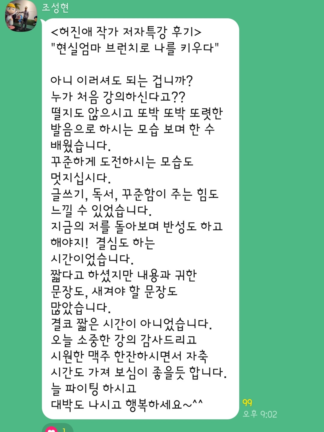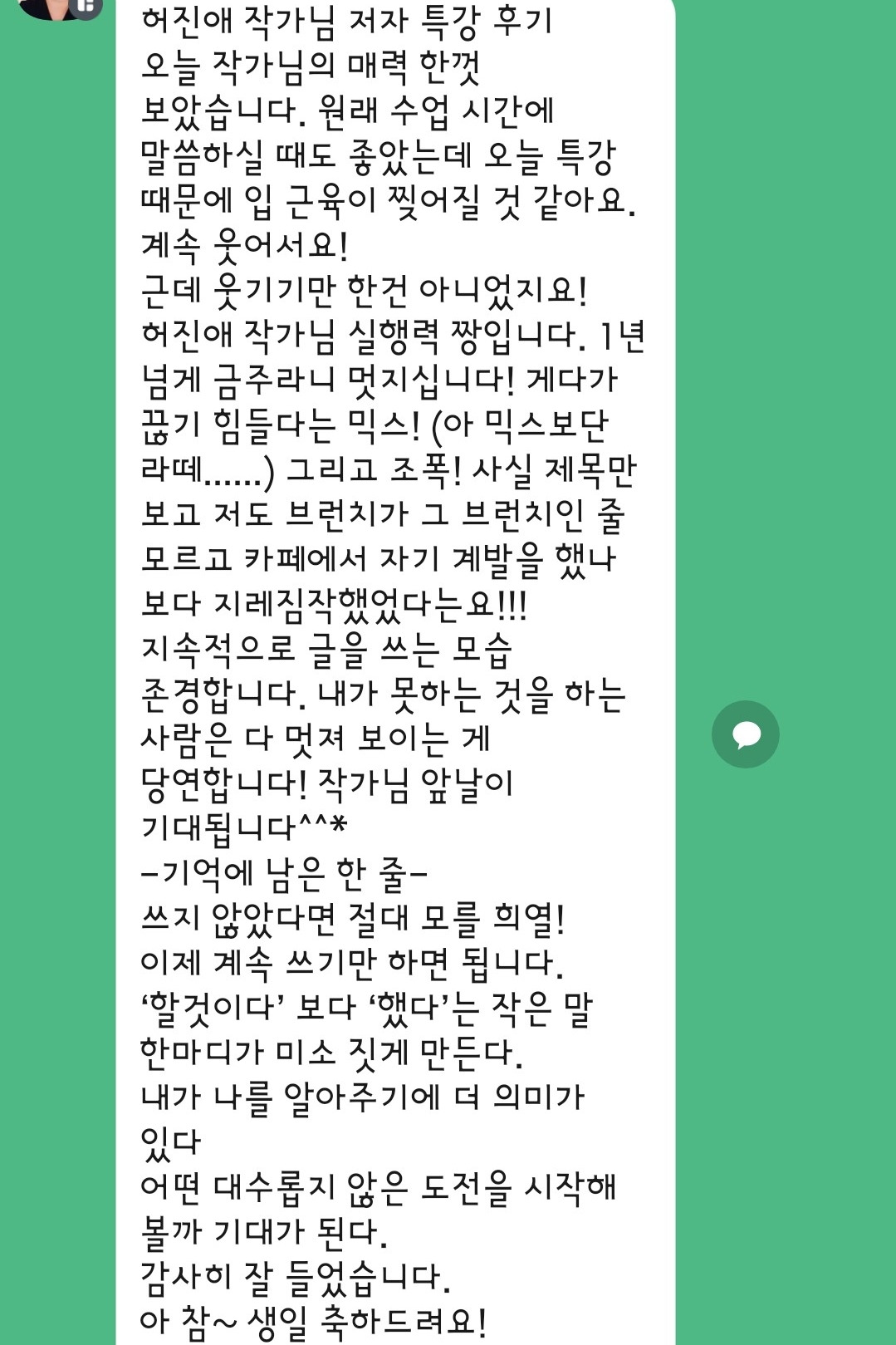 하고 안 하고는 한 끗차이지만 하고 나면 그 전의 나와는 다른 사람이 된다. 지금껏 경험하지 못한 느껴보지 못한 일들과 감정들이 내 주위를 배회한다. 그것을 잡는 것은 '나'여야만 한다. 기회는 있지만 보고만 있어서는 내 것이 아니다. 다음에 두 번째 책으로 다시 설 수 있기를. 그때는 오늘보다는 여유가 생기길 바라면서. 내 생애 첫 저자특강은 진하게 남았다. 나에게 준 생일 선물이다.