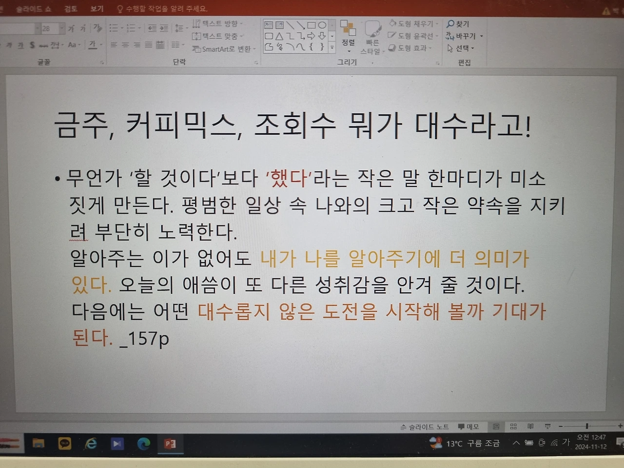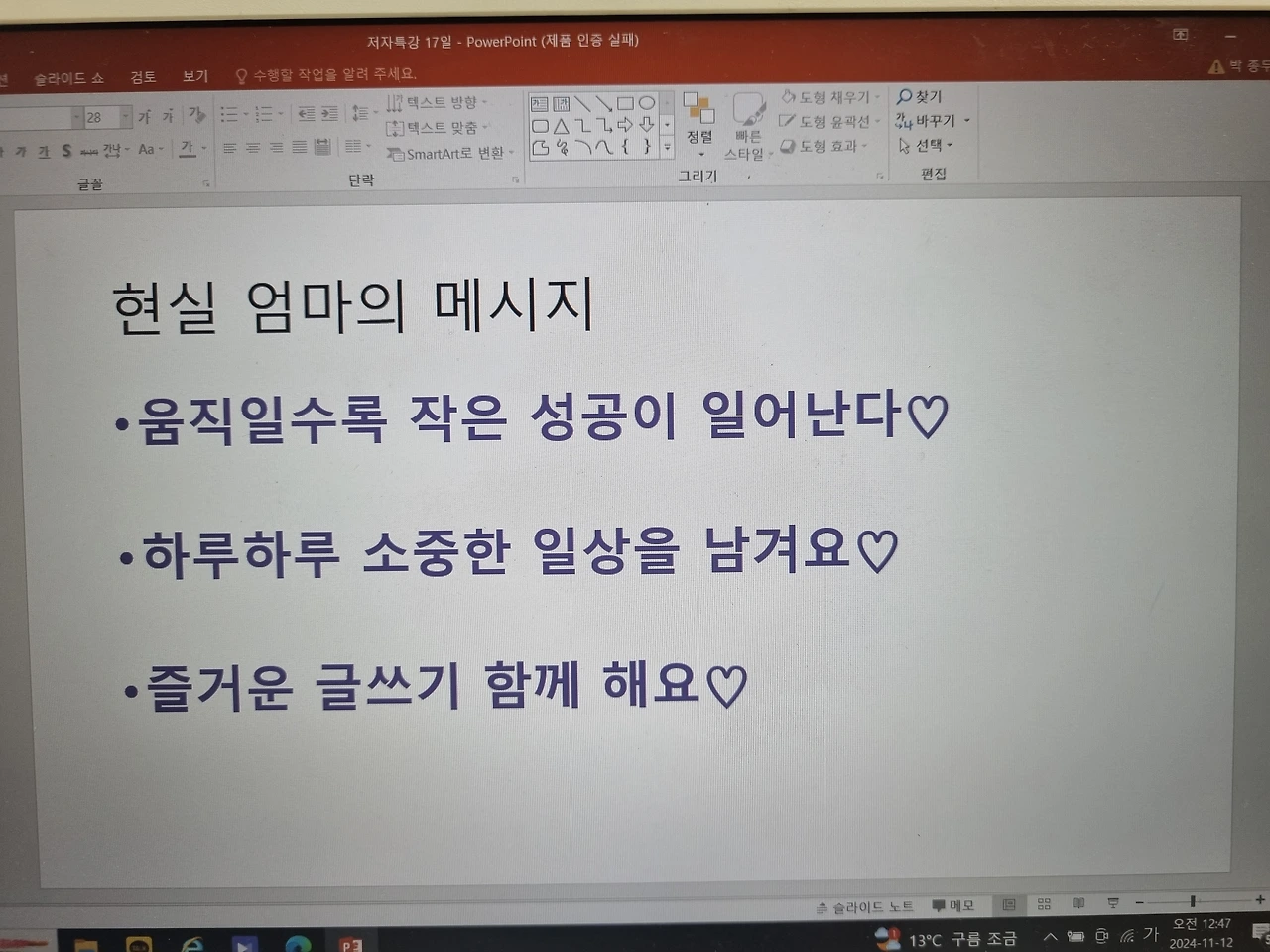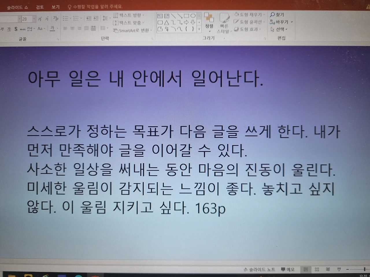 넉넉히 보름뒤로 잡았지만 그 기간 동안 강의연습만 할 수는 없었다. 머리털 나고 PPT작업도 처음 해보았다. 사진과 글을 화려하게 꾸밀 수는 없었지만 내가 할 수 있는 선에서 전달하고자 하는 말은 분명히 적어두었다. 남편의 말에도 힘이 났다. "처음부터 어떻게 잘하노. 써놓고 보고 읽으면서 하면 되지. 아무도 신경 안 쓴다."