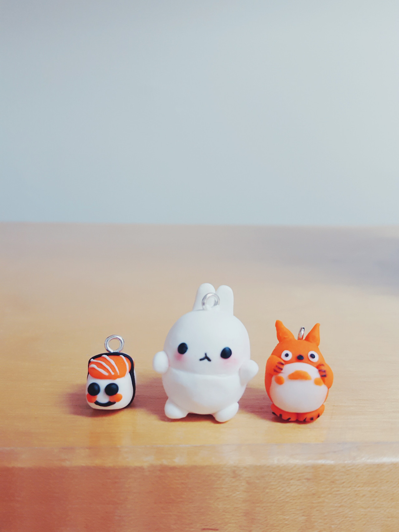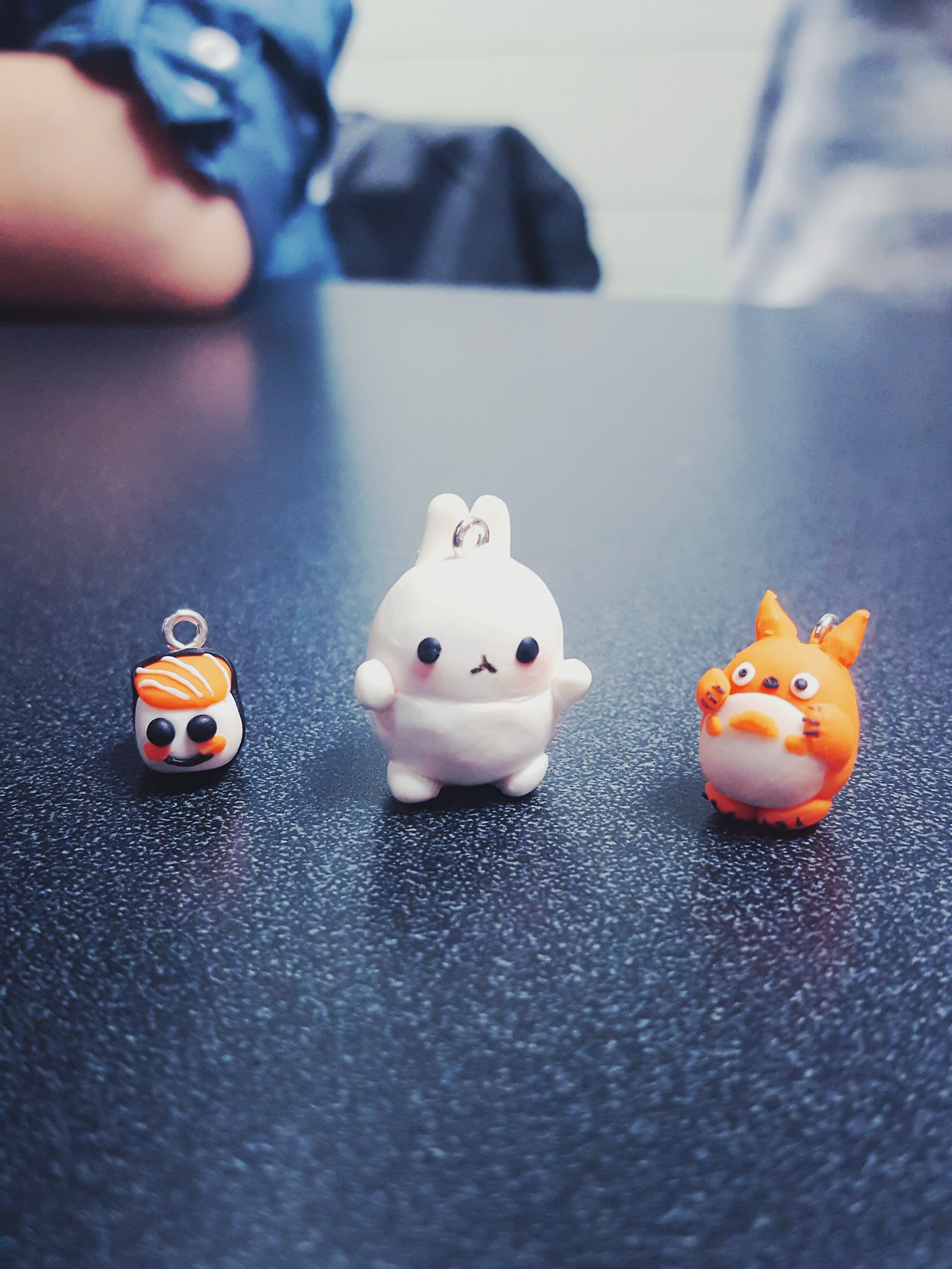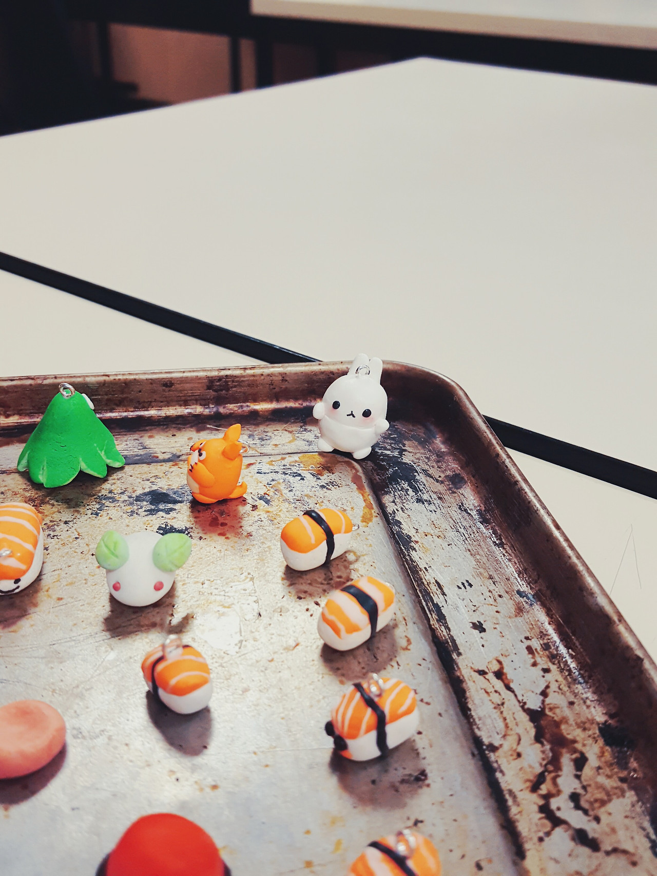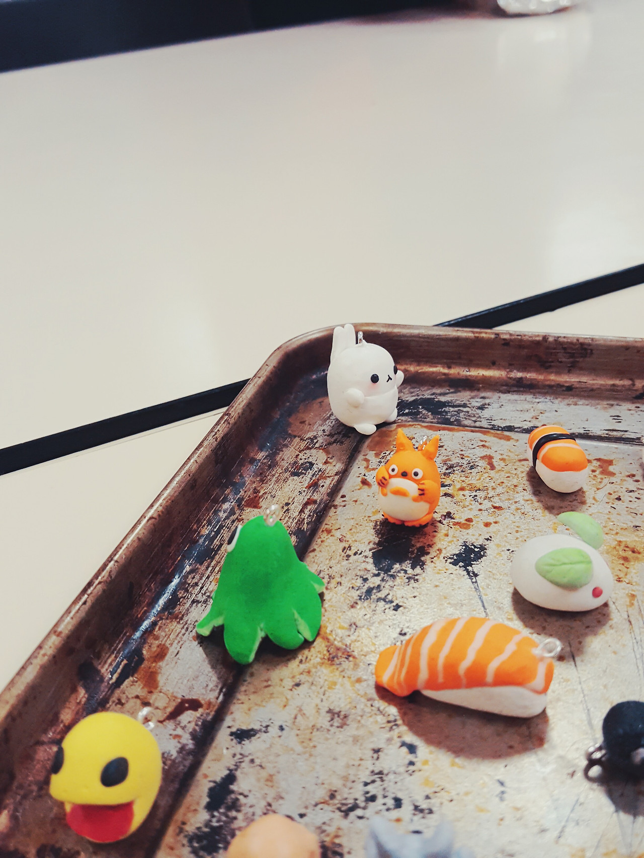 원래는 sushi clay charm이 테마였지만 사람이 예상보다 적게 와서 남은 시간 동안 마음껏 만들고 싶은 걸 만들 수 있었던 세션도 있었다. 난 그렇게 창의적인 사람은 못 되어서 그날의 목표였던 sushi와 한국에 있는 친구의 생일 선물로 보낸 토토로, 그리고 내가 제일 좋아하는 캐릭터인 몰랑이를 빚어내는데 그쳤지만 그 아이들이 내 손 끝에서 탄생하고 있다는 것만으로도 너무 신기했다. 엘사가 올라프를 만들었을 때 이런 느낌이었을까? 흰 색의 clay에는 먼지가 묻으면 바로 티가 나기 때문에 몇 번씩 물티슈로 닦아가면서 만들어낸 아이가 오븐에 들어갔다가 단단해져서 나오는 걸 보면 너무 뿌듯했다.