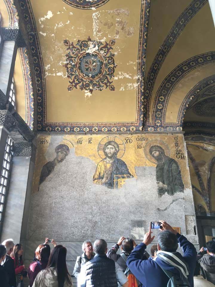 가이드의 설명을 듣고서야 고개가 끄덕여진다. 이곳은 본래 그리스 정교회 즉, 콘스탄티노플 시대에 성당으로 쓰였는데, 콘스탄티노플이 오스만 제국에 함락되면서 1453년부터 1931년까지 이슬람사원으로 쓰였다. 종이나 제단은 모두 사라졌고, 금빛 찬란한 모자이크 성화는 석회로 발라져 감춰졌다.