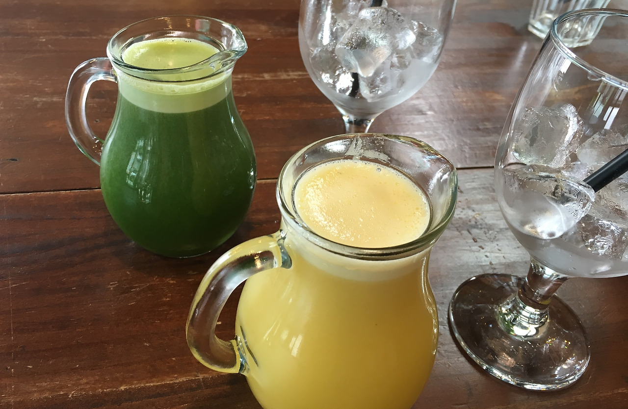 두런두런 얘기하며 걸어내려오니 여행이 고단함이 발끝부터 전해져온다. 발도 다리도 점점 무거워진다. 어딘가에서 차를 한잔 할까 하고 둘러보다가 멋스럽고 큰 곳들이 많아 자꾸 지나친다. 맘속으로는 가려던 곳이 있었다. 올라오던 길에 만난 노가리슈퍼 옆에 작은 카페가 떠올랐다. 우리의 마지막 발길이 비로소 휴식한다. 카페는 아주 작았는데 카운터 앞에 싱싱한 과일이 가지런히 진열돼 있었다. 냉장고에 들어 있는 과일이 아니라는 게 더 신선해보였다. 메뉴판을 보니 쥬스 조합이 신기했다.
