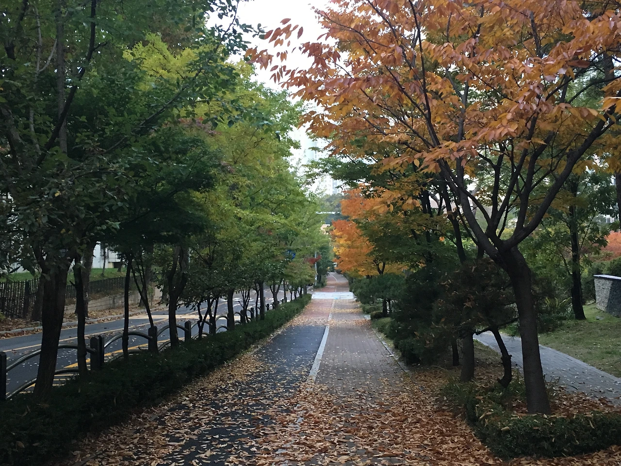 한 바퀴 돌고 집으로 향하는 길에서 진기한 풍광을 만난다. 작은 길을 사이에 두고 가로수 빛깔이 아주 확연하게 갈린다. 왼쪽은 초록과 연두고, 오른쪽은 푸른빛이 좀 남아 있긴 하지만 단풍이 곱게 물들고 있었다. 단풍 드는 것이 우월하고, 여전한 초록이 열등한 것도 아닌데 괜히 왼쪽 가로수들을 보면 안쓰러운 느낌이다. 처진다는 느낌이랄까? 그러다 이런 생각도 든다. 초록이 기세등등하게 남아 있으니 여전한 혈기를 자랑하는 것일 수 있지 않냐고.