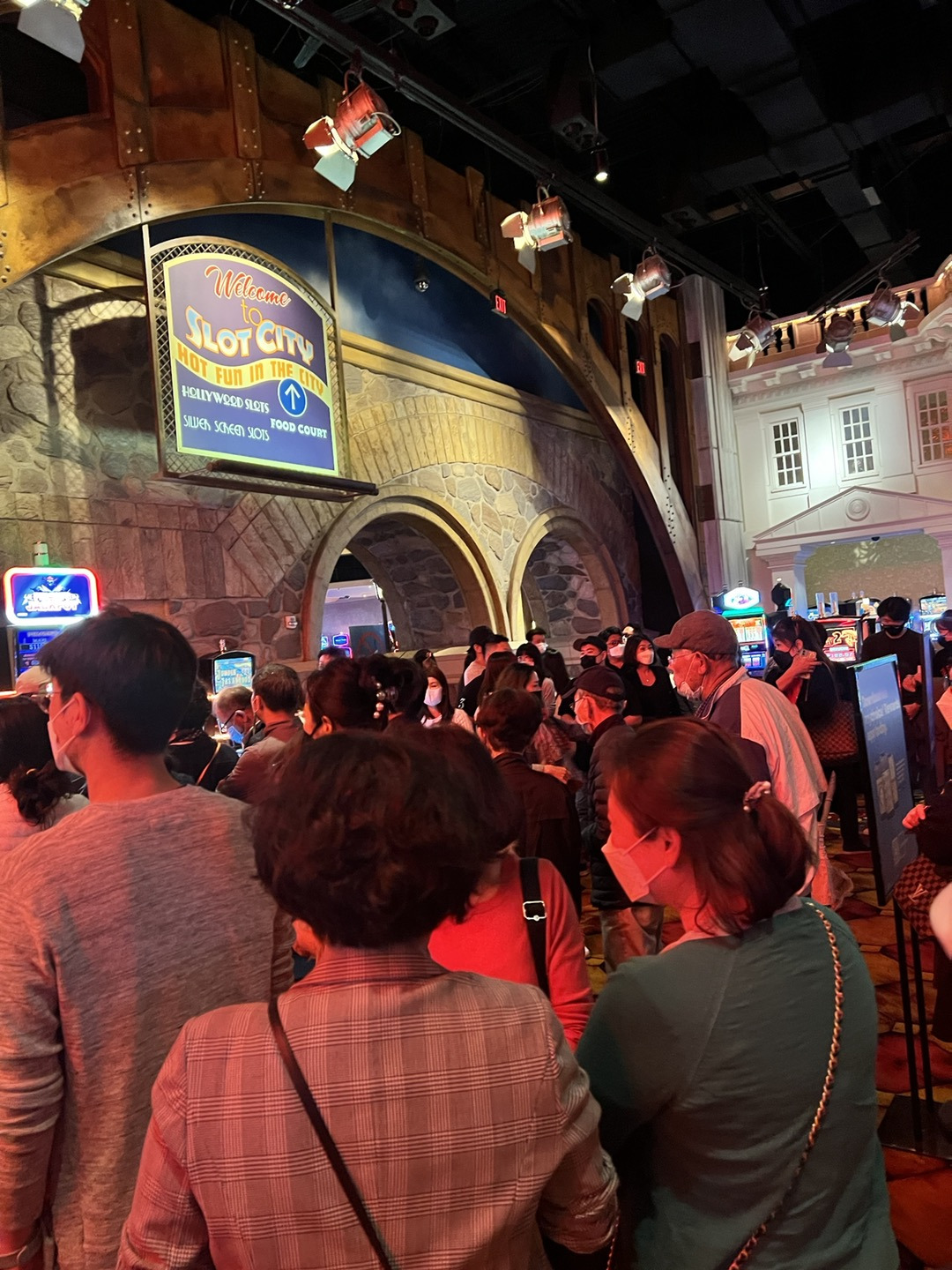 암튼 생각지 않은 카지노 풍경까지 여유롭게 거닐며 지나가는 행운도 얻었다. 그러다 이벤트홀까지 거의 다 왔는데 어? 미국에서 한국 사람을 이렇게 많이 본건 거의 처음인 듯 많은 인파에 깜짝 놀랐다. 컴컴하고 붉은빛이라 처음엔 사람들 무리라고만 생각했는데 가까이 보니 멋지게 차려입은 남녀노소가 저마다 티켓을 들고 줄을 서서 자리를 확인하는 모습이었다. 웅성웅성…