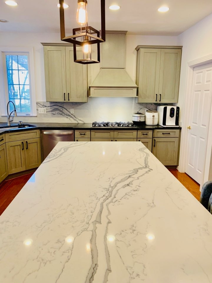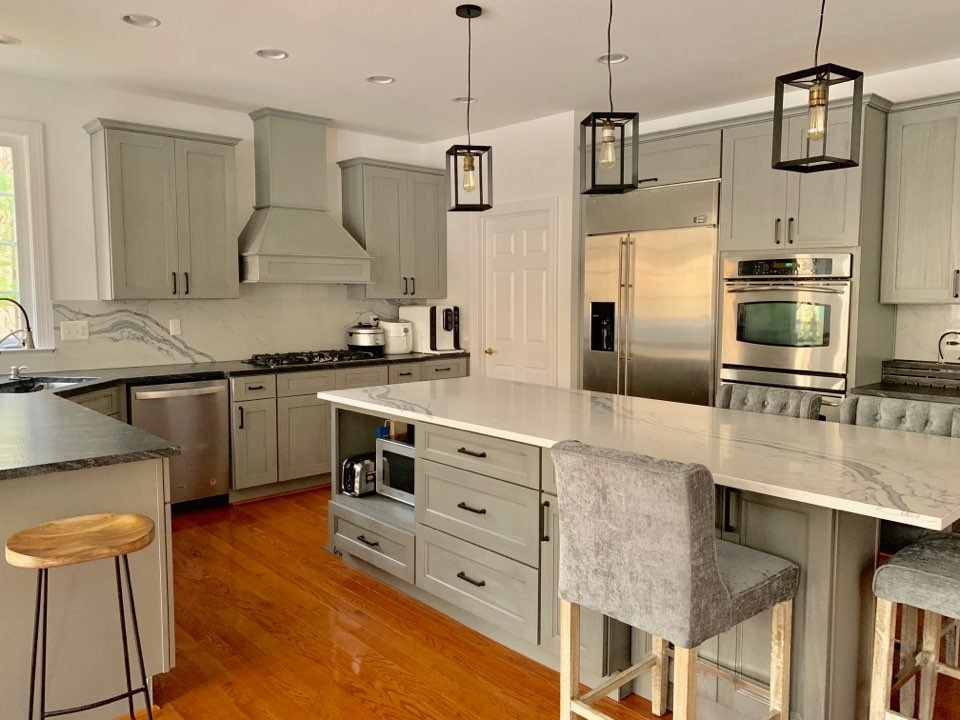 주방 또한 밝아졌다. 체리의 늙으스레한 어둠이 걷히고 밝은 회색 톤이 전체 수납장을 차지하고 카운터 탑은 흰색 대리석 바탕에 회색 무늬가 서예로 붓칠 해 놓은 것처럼 번져있고 카운터 의자는 회색 천 의자로 편안한 주방을 만들었다. 특히나 오븐의 쓰임새가 오직 빵 굽는 용도로만 알았다가 미국 음식 대부분을 오븐으로 만든 음식문화 때문에 두 개의 오븐이 길게 아래로 되어있는 은빛 스테인리스 스틸이 젠의 느낌을 확실히 살렸다.